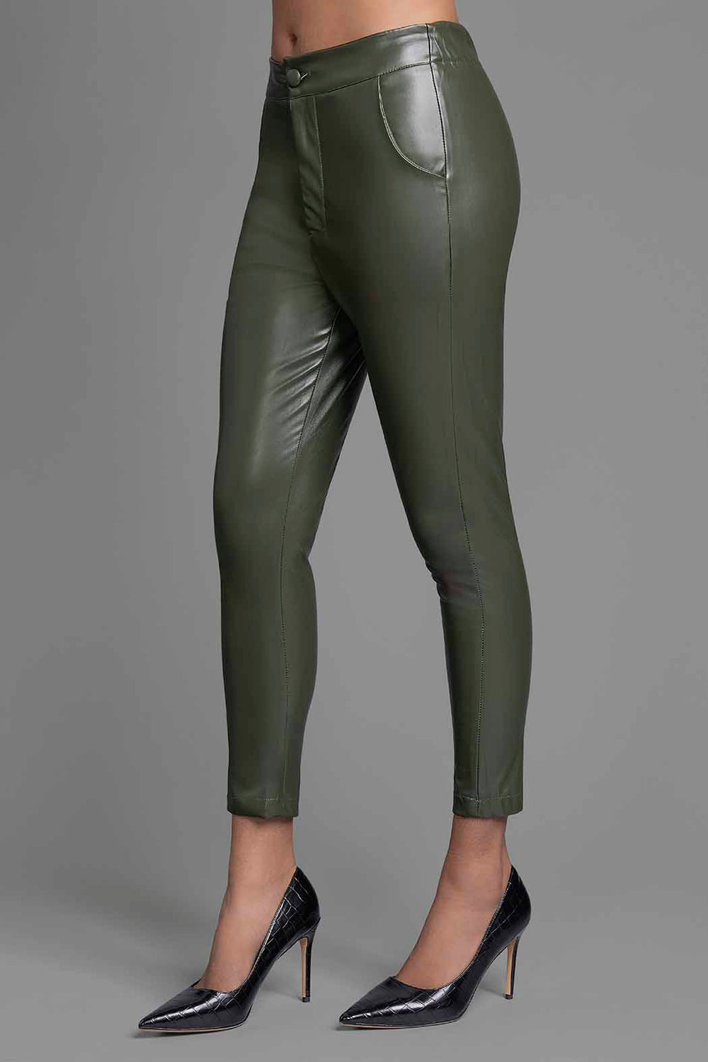 Pantalón Ajustado Con Efecto Piel Y Tiro Medio-Alto. Incluye Bolsillos Laterales Y Cierre Frontal Con Botón. Diseño Que Se Ajusta Al Cuerpo Con Piernas Rectas A La Altura Del Tobillo. Ideal Para Un Look Moderno Y Sofisticado, Perfecto Para Salidas Nocturnas O Eventos Casuales Con Un Toque Elegante.