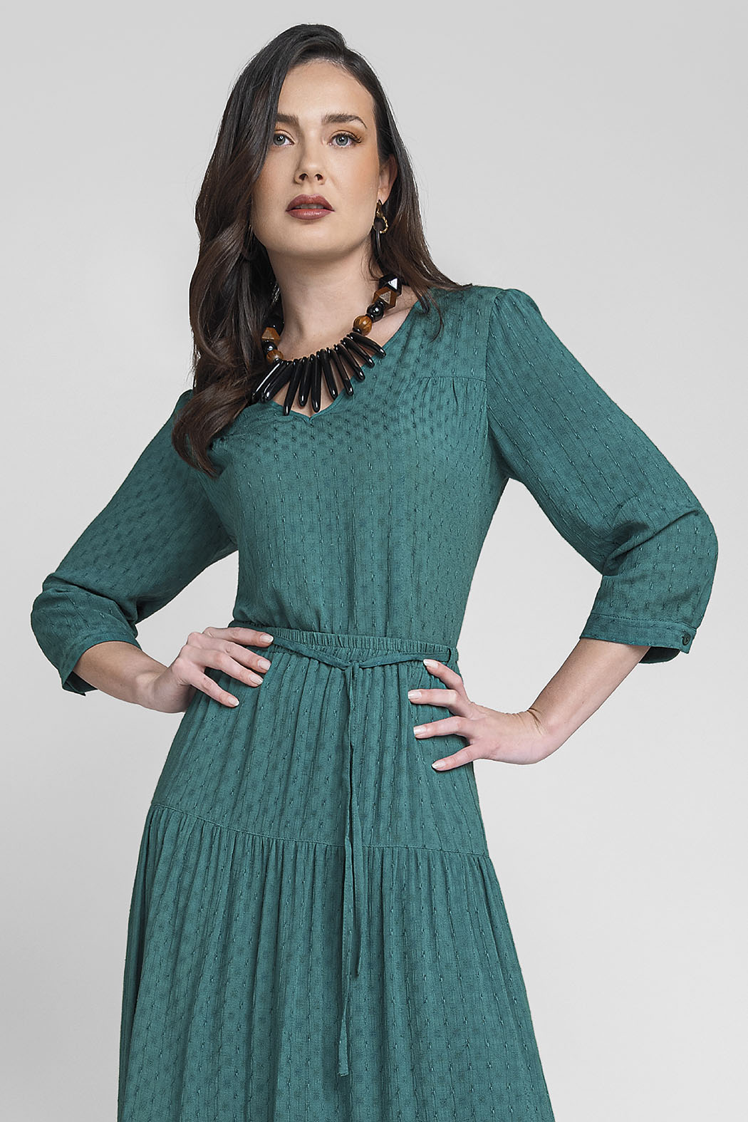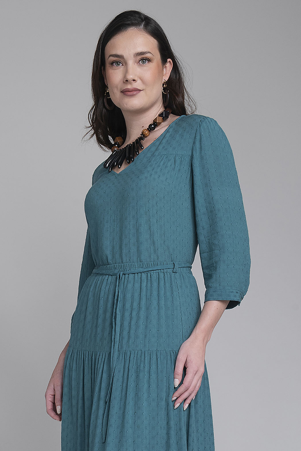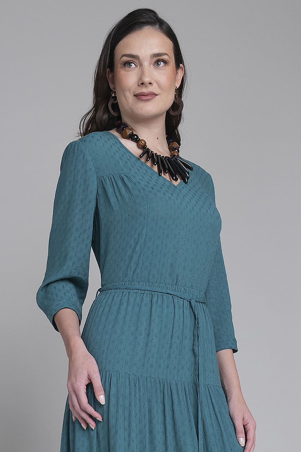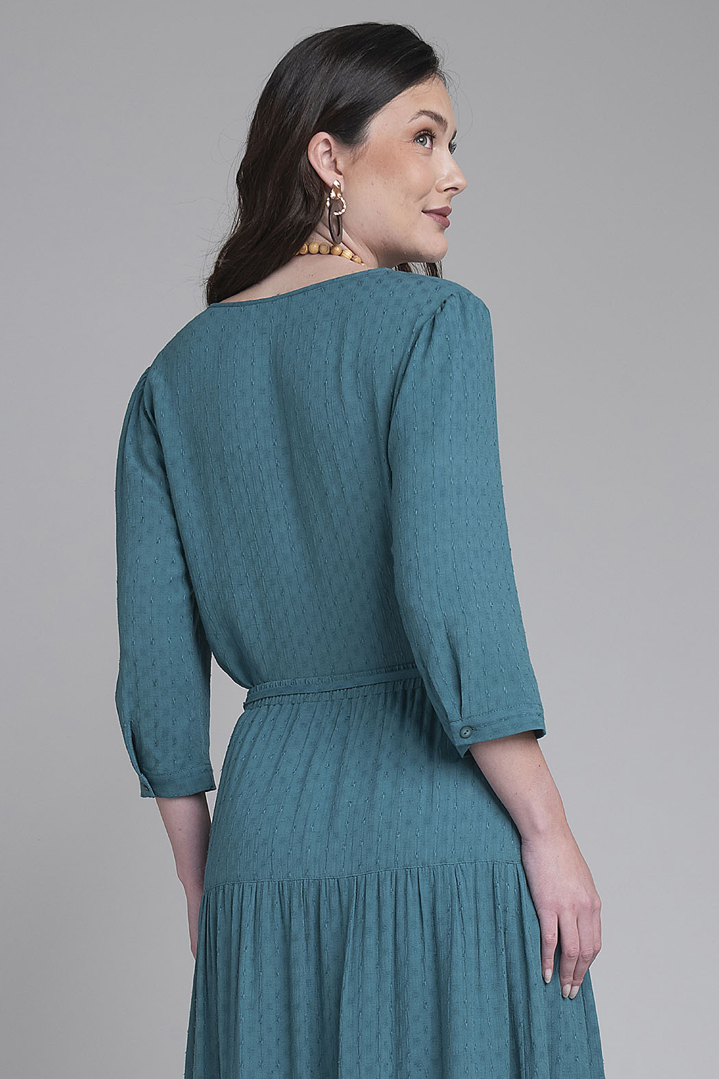 Blusa De Tres Cuartos Destaca Por Su Profundo Tono Azul Petróleo Y Su Delicado Tejido Con Textura, Que Añade Relieve Y Elegancia A La Prenda. Presenta Un Favorecedor Escote En V Y Un Corte Estructurado Con Discretas Costuras Frontales Que Estilizan La Silueta De Manera Natural. El Diseño Se Completa Con Un Ligero Fruncido En Los Hombros Que Aporta Un Toque De Volumen Femenino, Convirtiéndola En Una Pieza Clave Tanto Para Conjuntos Profesionales Con Pantalón De Sastre Como Para Un Look Casual Refinado.