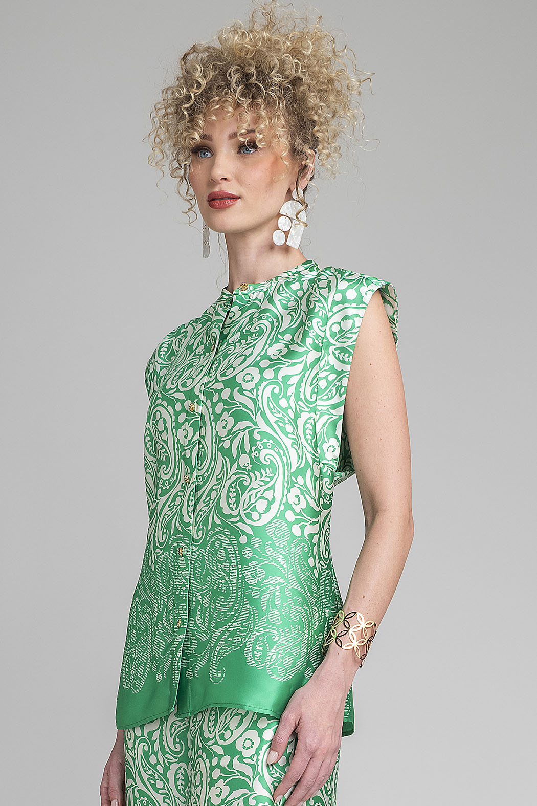 Elegante Blusa Destaca Por Su Vibrante Color Verde Y Un Sofisticado Estampado En Contraste Blanco. Presenta Un Diseño Moderno Con Un Degradado Visual Hacia El Dobladillo, Ideal Para Un Look Fresco Y Profesional. Corte Regular Sin Mangas Con Hombros Extendidos, Abotonadura Frontal Completa Con Botones Dorados Decorativos, Ideal Para Un Look Fresco.