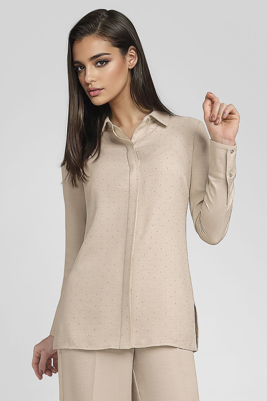 Camisa De Botones Es Una Pieza Esencial Que Irradia Una Elegancia Sutil Y Moderna, Perfecta Para Iluminar Cualquier Atuendo Formal O De Noche. Confeccionada En Un Tejido Ligero De Caída Impecable, La Prenda Destaca Por Su Delicado Acabado De Micro-Pedrería Brillante Distribuida Uniformemente, Que Captura La Luz Con Suavidad. Su Diseño Clásico Incluye Un Cuello De Solapa Tradicional, Una Botonadura Frontal Oculta Que Mantiene Una Estética Limpia, Y Mangas Largas Con Puños Definidos, Logrando Un Equilibrio Perfecto Entre La Sobriedad Del Sastre Y Un Toque De Brillo Sofisticado.