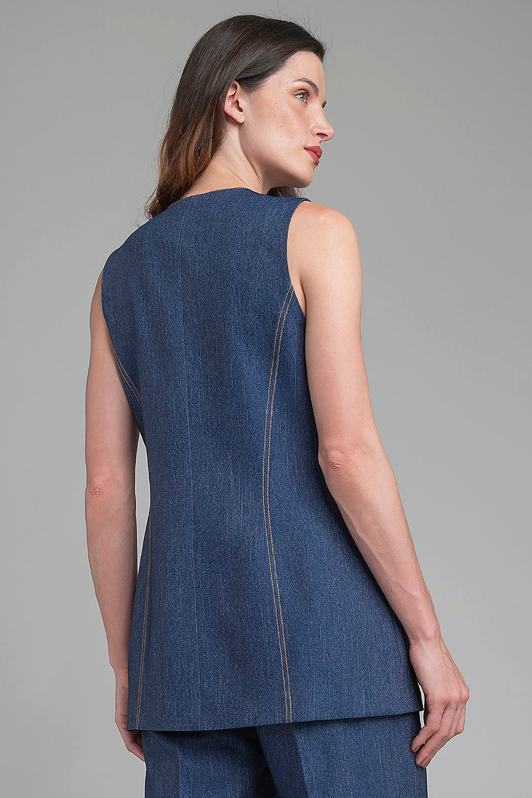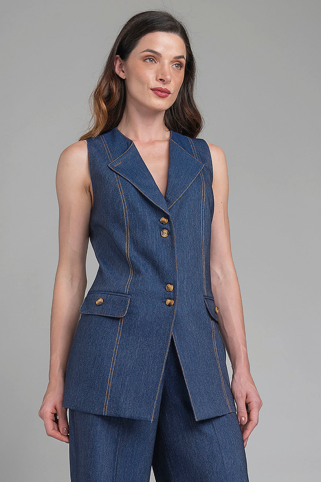 Chaleco Sastre En Mesclilla Obscura Redefine El Concepto De Elegancia Casual Con Una Silueta Entallada Y Estructurada. Destaca Por Su Sofisticado Cuello De Solapa En Pico Y Un Cierre Frontal De Cuatro Botones Con Acabado Amaderado, Complementado Por Dos Bolsillos Laterales Con Solapa Decorativa. Las Costuras Verticales En Contraste Ocre No Solo Realzan La Confección De La Prenda, Sino Que También Estilizan Visualmente La Figura, Convirtiéndolo En Una Pieza Versátil Ideal Para Un Look De Capas O Para Llevarse Como Protagonista.