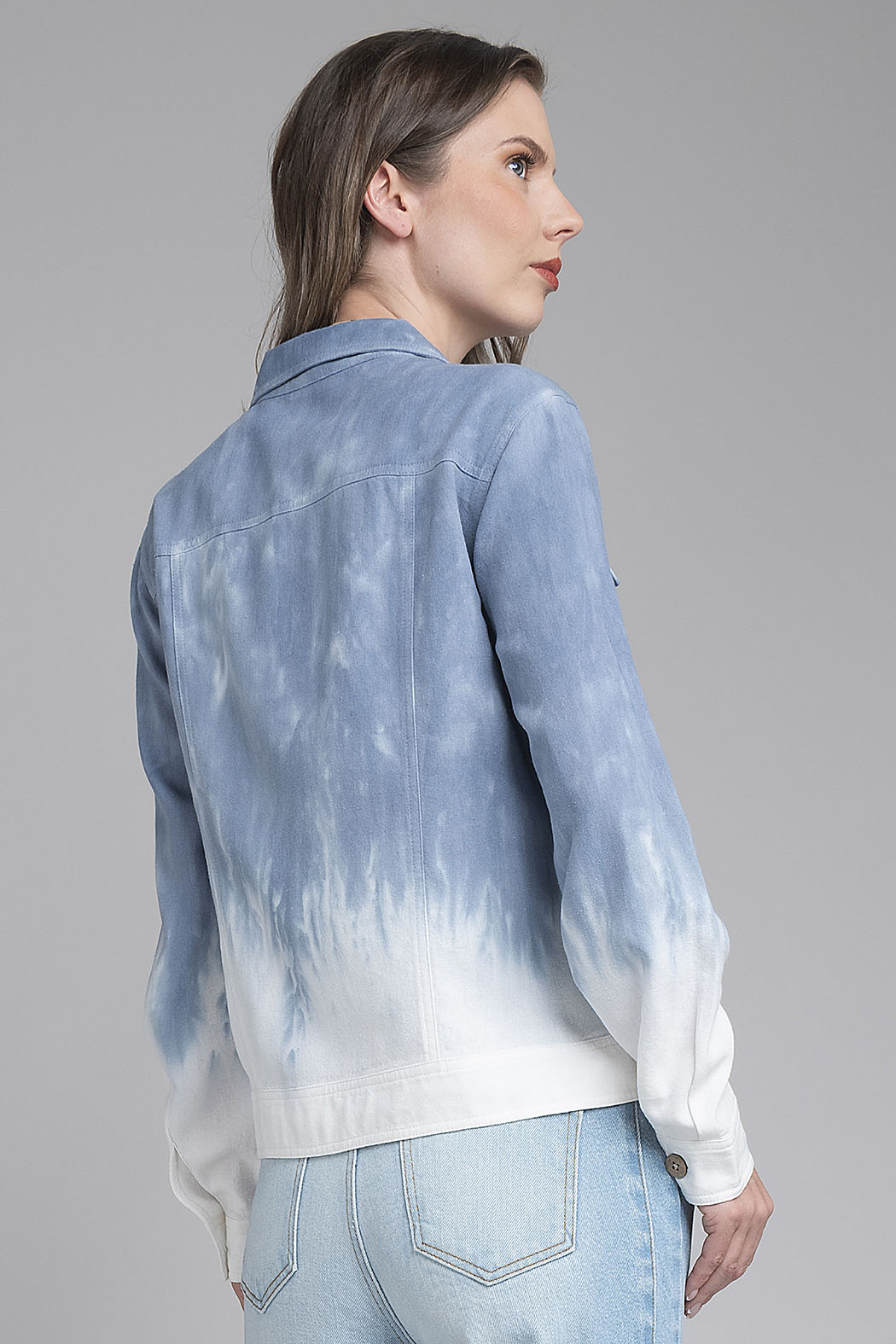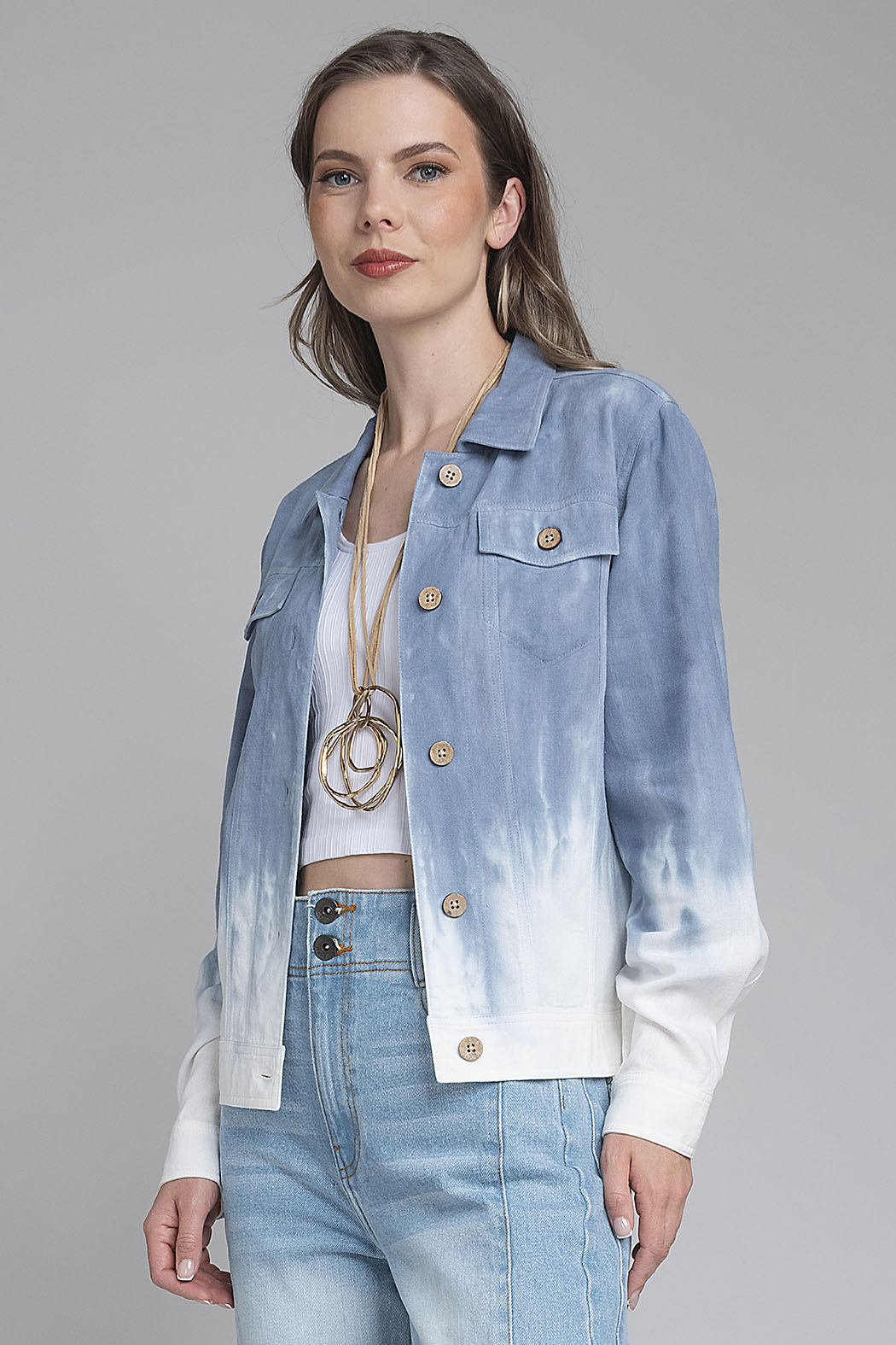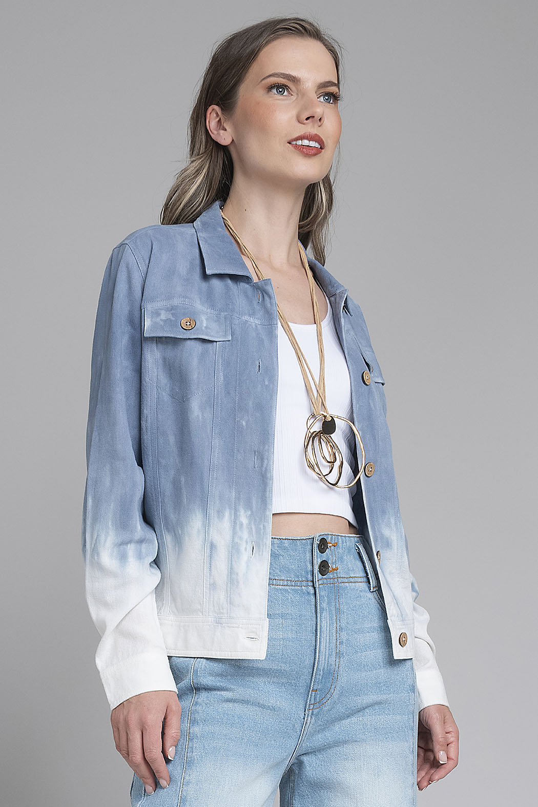 Chaqueta De Estilo Contemporáneo Es Una Pieza Clave Para Quienes Buscan Un Diseño Único. Confeccionada En Un Tejido Con Textura, La Prenda Presenta Un Impactante Efecto Degradado Que Transiciona Suavemente Desde Un Azul Denim En La Parte Superior Hasta Un Blanco Puro En El Bajo Y Los Puños. Su Estructura Clásica Incluye Un Cuello De Solapa, Dos Bolsillos De Parche Con Tapa En El Pecho Y Un Cierre Frontal De Botones De Madera Grabados, Que Aportan Un Contraste Cálido Y Orgánico Al Diseño. Con Un Corte Entallado Y Costuras Visibles Que Realzan La Silueta, Esta Chaqueta Es La Opción Perfecta Para Añadir Carácter Y Modernidad A Cualquier Atuendo Casual.