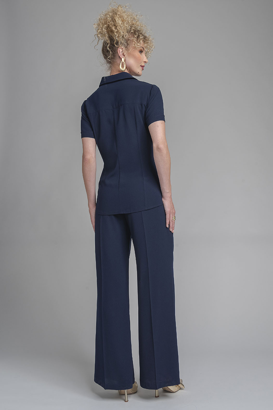 Conjunto De Dos Piezas Es La Definición De Sofisticación Funcional Para El Guardarropa Ejecutivo. Se Compone De Una Camisa De Manga Corta Con Cuello De Solapa, Cierre Frontal De Botones Dorados Y Un Distintivo Detalle De Herraje Metálico En La Cintura Que Estiliza La Figura, Junto Con Un Pantalón De Vestir De Pierna Ancha (Wide Leg) Y Tiro Alto Que Aporta Una Caída Fluida Y Profesional, Ideal Para Proyectar Seguridad Y Elegancia En Cualquier Entorno De Negocios.