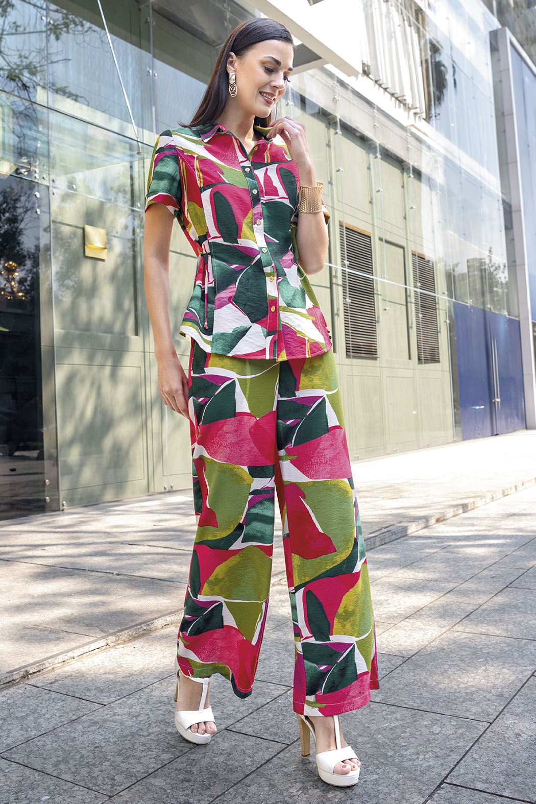 Conjunto De Dos Piezas Con Camisa De Manga Corta Y Pantalón Recto, Confeccionado En Tela Ligera Con Estampado Multicolor. Diseño Cómodo Y Moderno, Ideal Para Un Look Fresco Y Versátil.