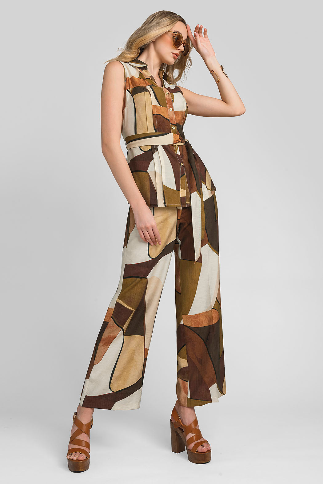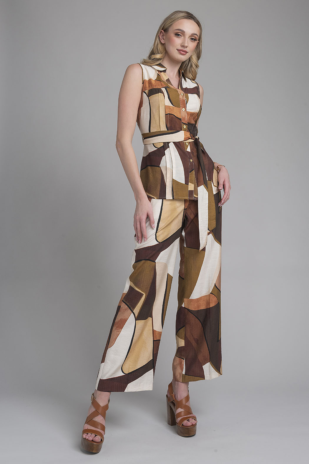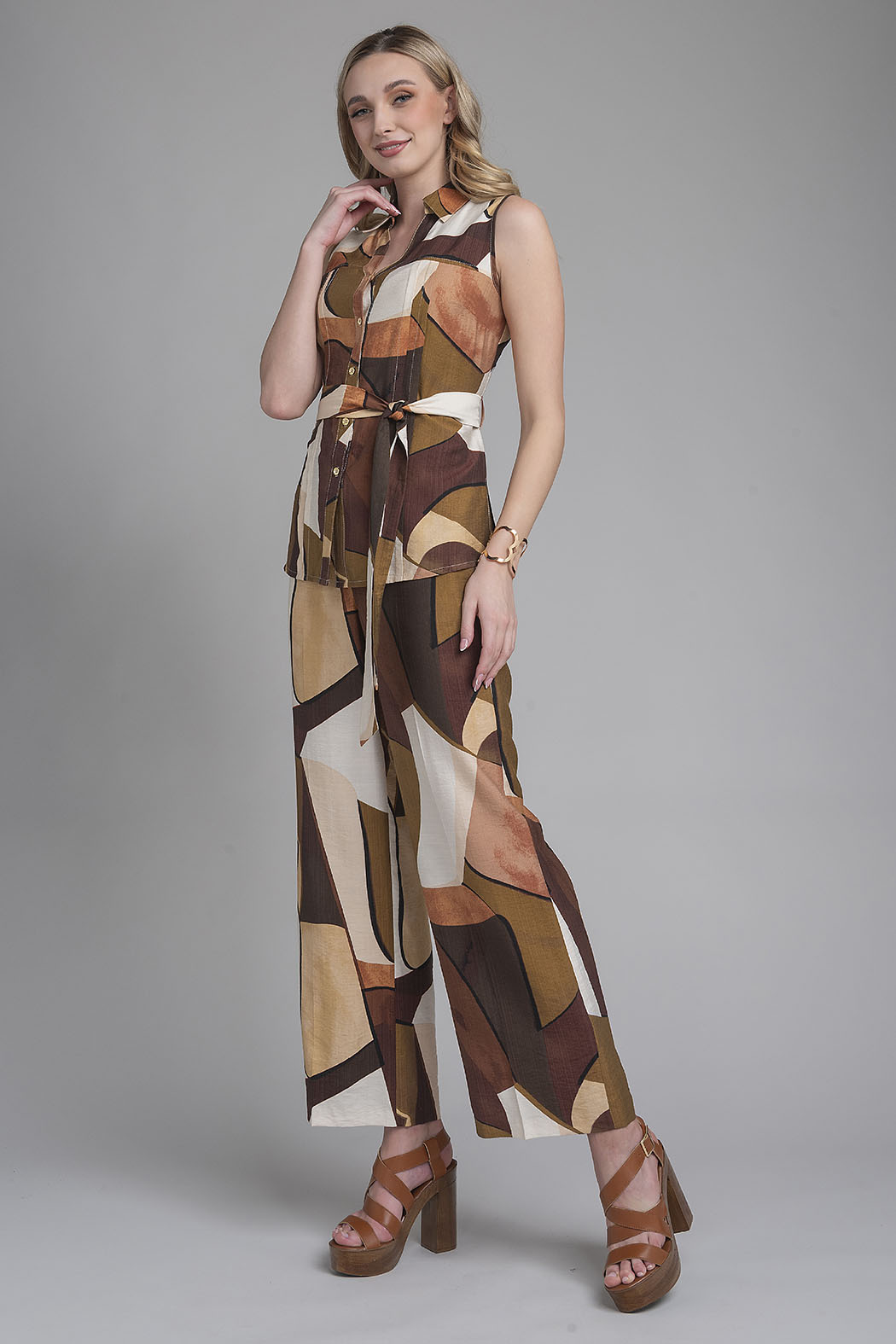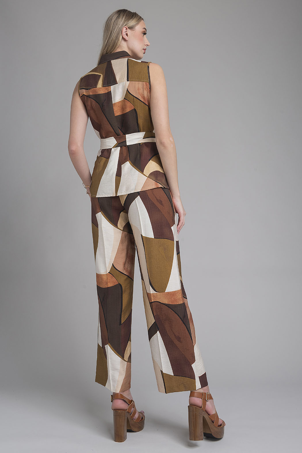 Conjunto De Dos Piezas Destaca Por Un Vibrante Estampado Geométrico Abstracto En Tonos Tierra, Terracota Y Crema, Ofreciendo Una Estética Moderna Y Artística. La Parte Superior Es Una Blusa Sin Mangas Con Cuello De Solapa, Botonadura Frontal Y Un Cinturón De Tela A Juego Que Define La Cintura Para Una Silueta Favorecedora. Se Complementa Con Unos Pantalones De Pernera Ancha Y Tiro Alto Que Fluyen Con Elegancia, Confeccionados En Un Tejido Ligero Con Textura, Ideales Para Un Evento De Día O Un Look De Oficina Sofisticado.