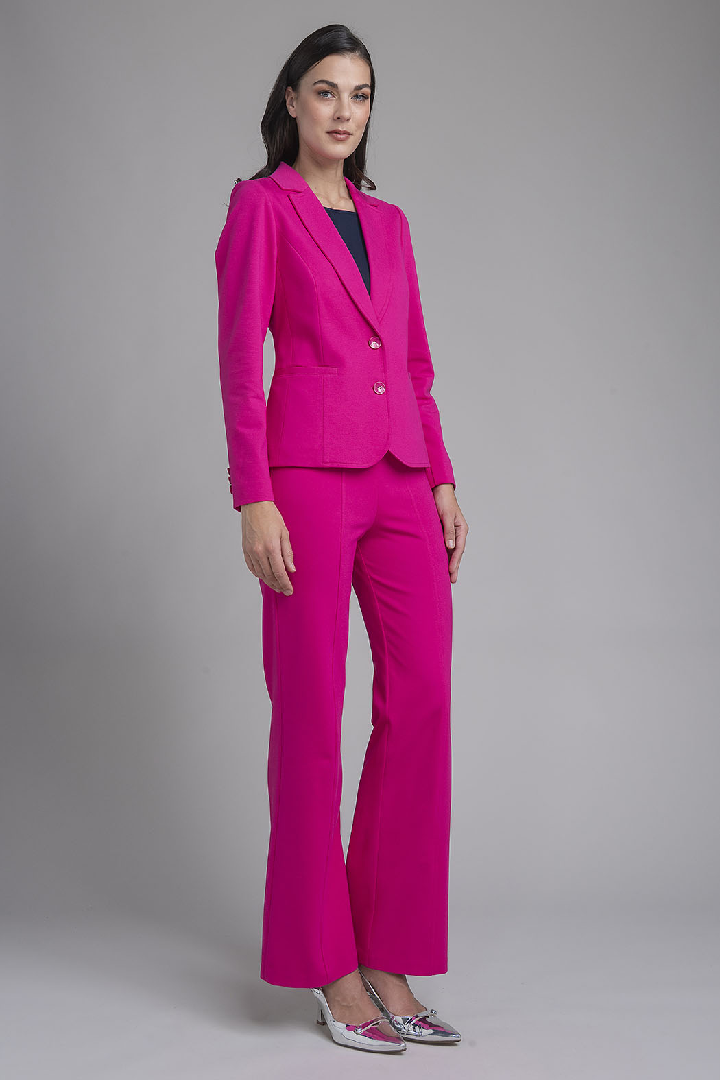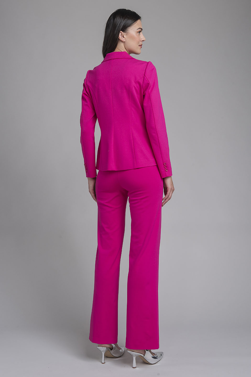 Impactante Traje Sastre En Color Fiusha Vibrante Compuesto Por Un Blazer Estructurado Y Pantalón A Juego. El Blazer Cuenta Con Solapas Clásicas, Cierre De Un Solo Botón Y Bolsillos De Ojal, Mientras Que El Pantalón De Corte Recto Y Tiro Alto Ofrece Una Silueta Impecable Y Contemporánea, Ideal Para La Mujer Que Busca Destacar Con Seguridad En El Entorno Profesional.
