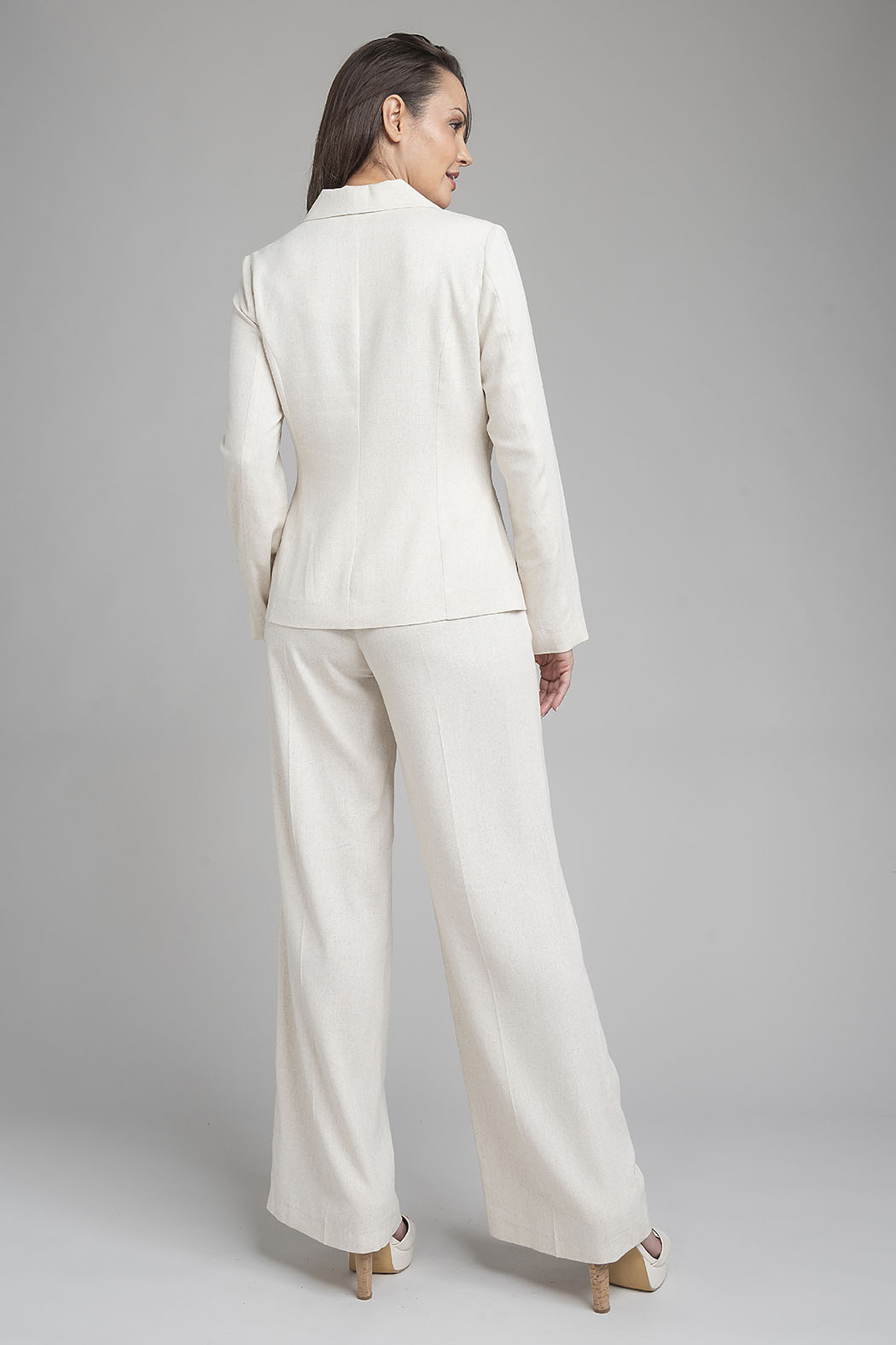 Traje Sastre De Dos Piezas En Un Suave Tono Crema Es La Personificación De La Elegancia Profesional Y El Estilo Atemporal. El Conjunto Incluye Un Blazer Entallado Con Solapas De Muesca, Cierre Frontal De Tres Botones En Contraste Y Bolsillos De Ojal, Junto Con Un Pantalón De Corte Recto Y Pierna Ancha Que Presenta Un Favorecedor Detalle De Raya Marcada Para Alargar La Silueta. Confeccionado En Un Tejido Con Textura Ligera, Este Conjunto Es Perfecto Para Proyectar Una Imagen Impecable Y Moderna En La Oficina O Eventos Formales.