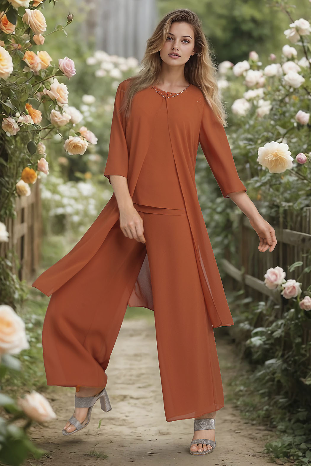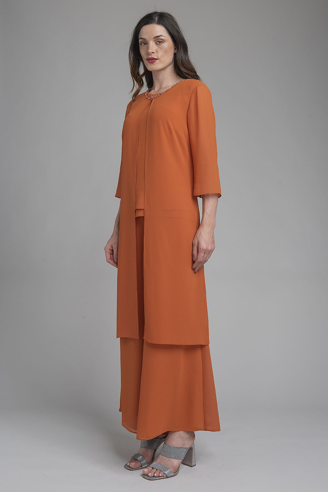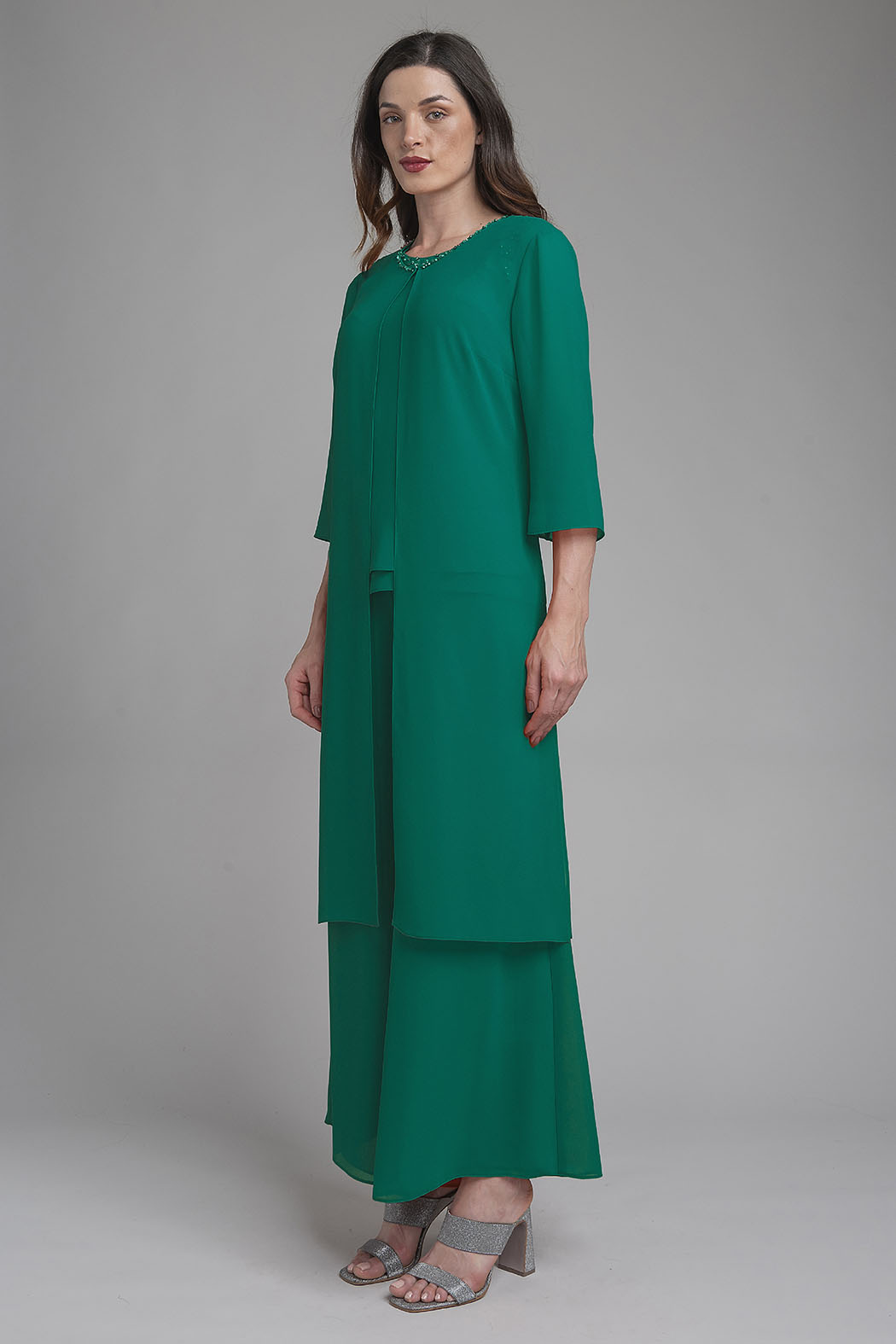 Sofisticado Conjunto De Tres Piezas Es La Opción Definitiva Para Quienes Buscan Un Look Monocromático Elegante Y Con Un Toque De Brillo. El Set Se Compone De Un Top De Tirantes Fluido, Cuyo Escote Redondo Destaca Por Un Exquisito Detalle De Pedrería Y Cristales Bordados Que Aportan Luminosidad Al Rostro. Se Complementa Con Una Chaqueta Larga De Frente Abierto Y Caída Ligera, Junto A Unos Pantalones Palazzo De Pierna Ancha Que Ofrecen Máximo Movimiento Y Comodidad Sin Perder La Formalidad. Confeccionado En Una Tela Suave Con Acabado Impecable, Este Conjunto Es Ideal Para Eventos Especiales, Ceremonias De Día O Cócteles Donde Desees Destacar Con Distinción Y Frescura.