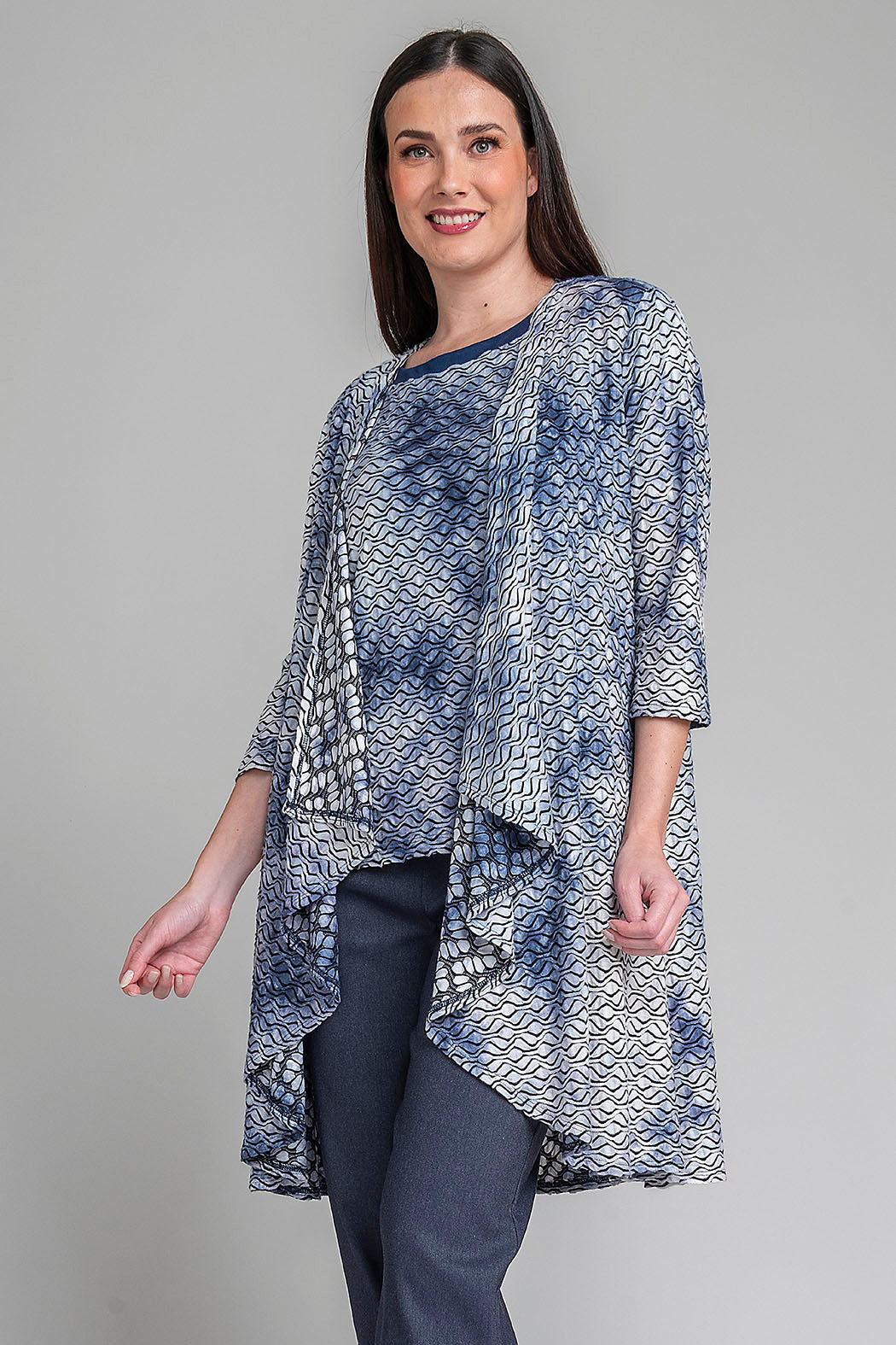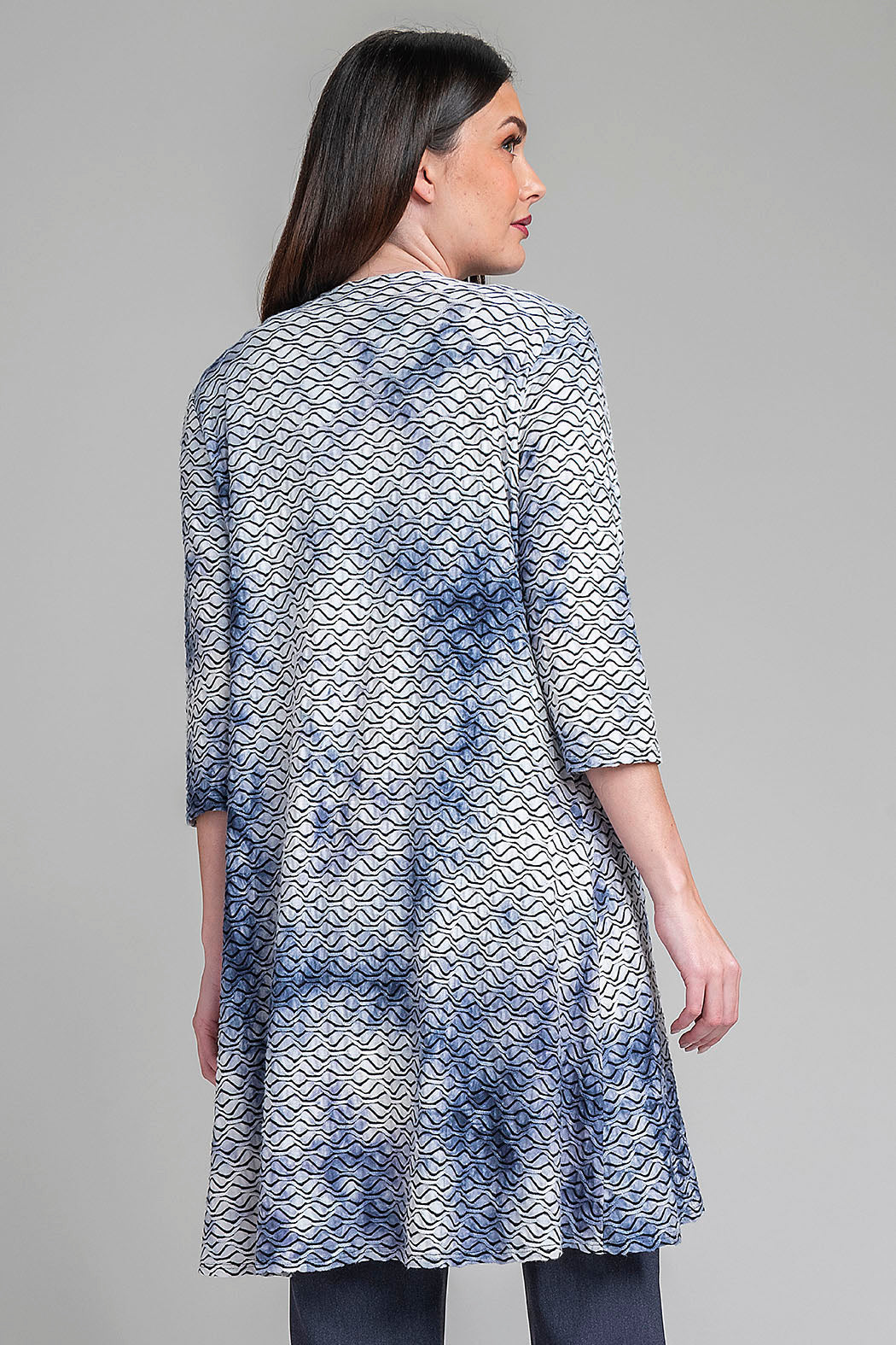 Chaqueta De Punto Tipo Cárdigan Es La Definición De Elegancia Fluida Y Confort Para Tu Catálogo De Temporada. Presenta Un Diseño De Frente Abierto Con Caída De Efecto Cascada Que Aporta Movimiento Y Un Aire Bohemio Sofisticado A Cualquier Conjunto. La Prenda Destaca Por Su Intrincado Estampado Geométrico De Ondas Y Panal En Una Paleta De Azul Cobalto Y Blanco, Realzado Por Un Efecto Teñido Tipo Mármol Que Crea Transiciones De Color Artísticas En Toda La Superficie. Con Mangas De Tres Cuartos Y Una Silueta Relajada, Este Cárdigan Es La Pieza De Capas Ideal Para Elevar Un Atuendo Básico De Jeans Y Camiseta O Para Complementar Un Vestido Liso, Ofreciendo Una Versatilidad Inigualable Con Un Toque De Diseño Contemporáneo.