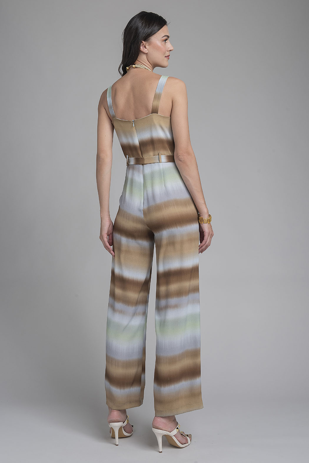 Jumpsuit De Silueta Fluida Destaca Por Su Llamativo Estampado De Rayas Horizontales Con Una Paleta De Tonos Tierra, Mostaza Y Verde Suave. Presenta Un Diseño De Escote Redondeado Y Tirantes Anchos, Complementado Por Un Cinturón De La Misma Tela Con Detalle De Cuentas De Madera Que Definen La Cintura. Sus Pantalones De Corte Ancho Aportan Movimiento Y Comodidad, Convirtiéndolo En Una Prenda Ideal Para Un Look Veraniego Relajado Pero Sofisticado.