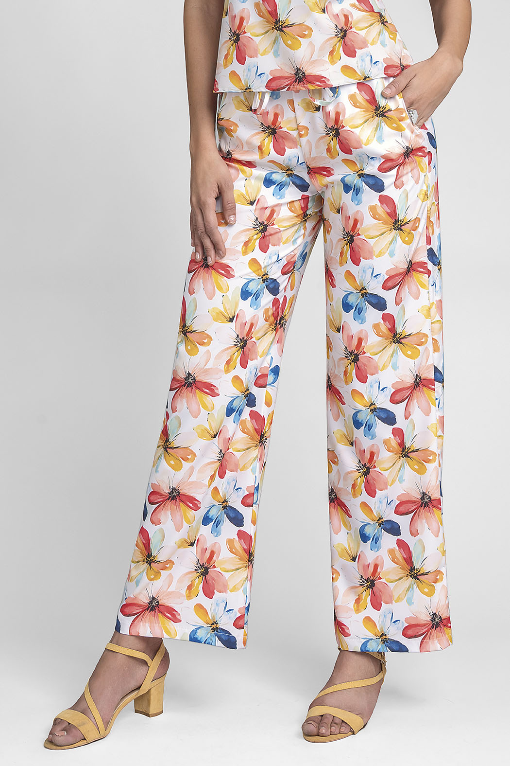 Pantalón De Pierna Ancha Es La Combinación Perfecta De Frescura Y Tendencia. Destaca Por Su Vibrante Estampado Floral Multicolor En Tonos Cálidos Y Azules Sobre Fondo Blanco, Diseñado Para Crear Un Impacto Visual Alegre Y Moderno. Cuenta Con Una Cintura Elástica Fruncida Y Un Cordón Ajustable Del Mismo Tejido Que Garantiza Un Ajuste Cómodo Y Personalizado A La Cintura. Su Caída Fluida Y Ligera Lo Convierte En La Prenda Ideal Para Días De Primavera, Permitiendo Una Total Libertad De Movimiento Con Un Aire Sofisticado Y Relajado.