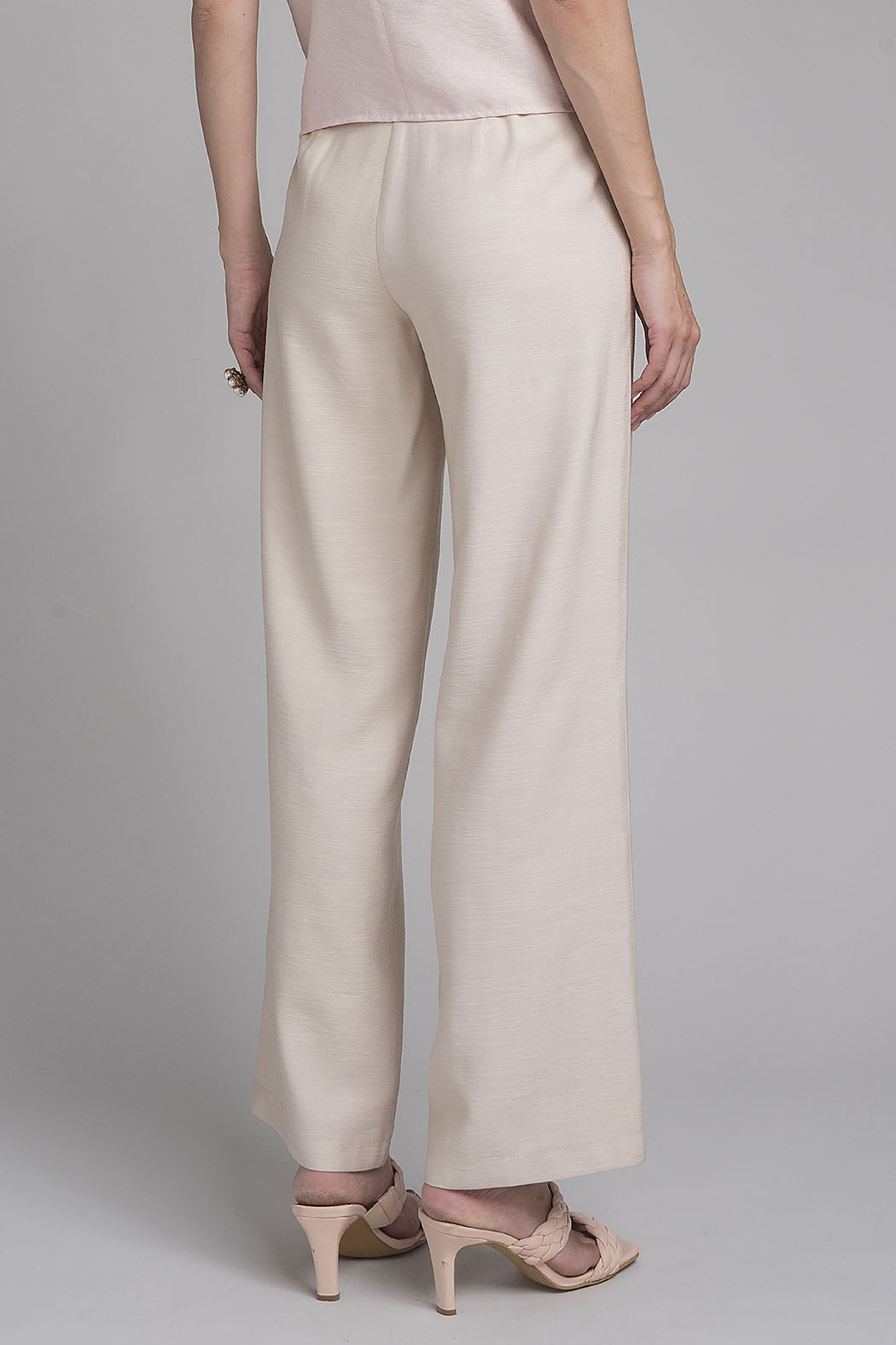 Pantalón De Corte Recto En Color Beige Es Una Pieza Clave Para Un Armario Profesional Y Versátil. Confeccionado En Un Tejido Con Textura Ligera De Grano Fino, Destaca Por Su Diseño De Talle Alto Con Pinzas Frontales Que Proporcionan Un Ajuste Impecable Y Estilizado. El Detalle Distintivo Lo Aportan Sus Trabillas Dobles Con Hebillas Metálicas Doradas En Los Costados, Que Incluyen Cintas Del Mismo Tejido Para Ajustar La Cintura, Logrando Un Equilibrio Perfecto Entre La Sofisticación De La Sastrería Clásica Y Detalles Modernos De Tendencia.