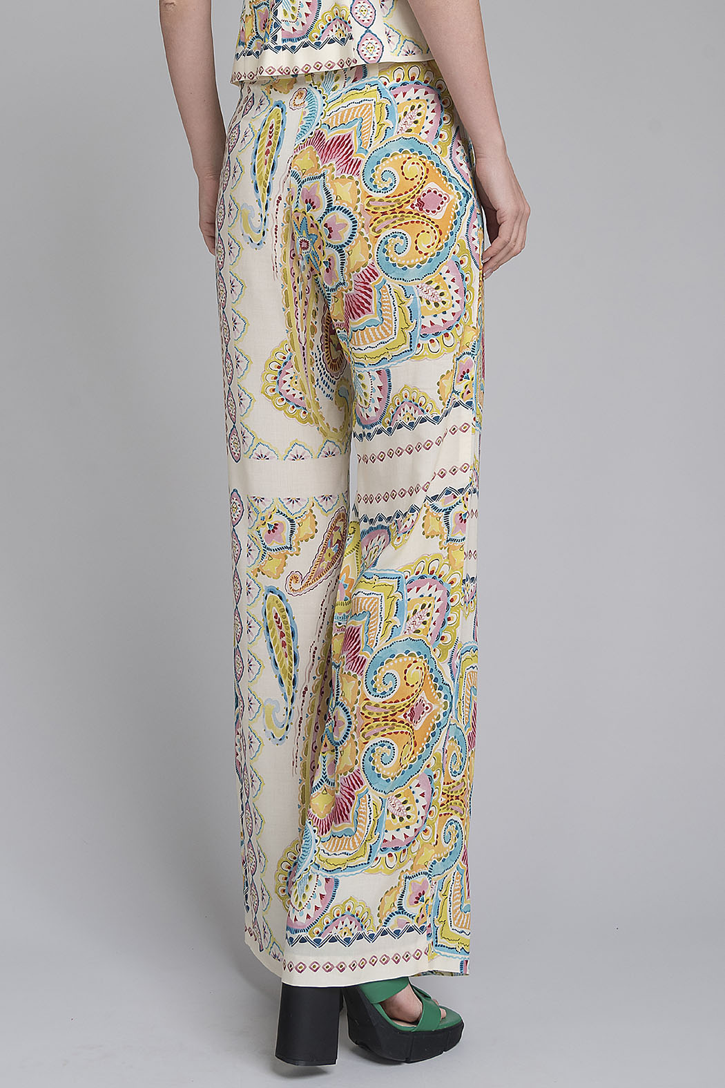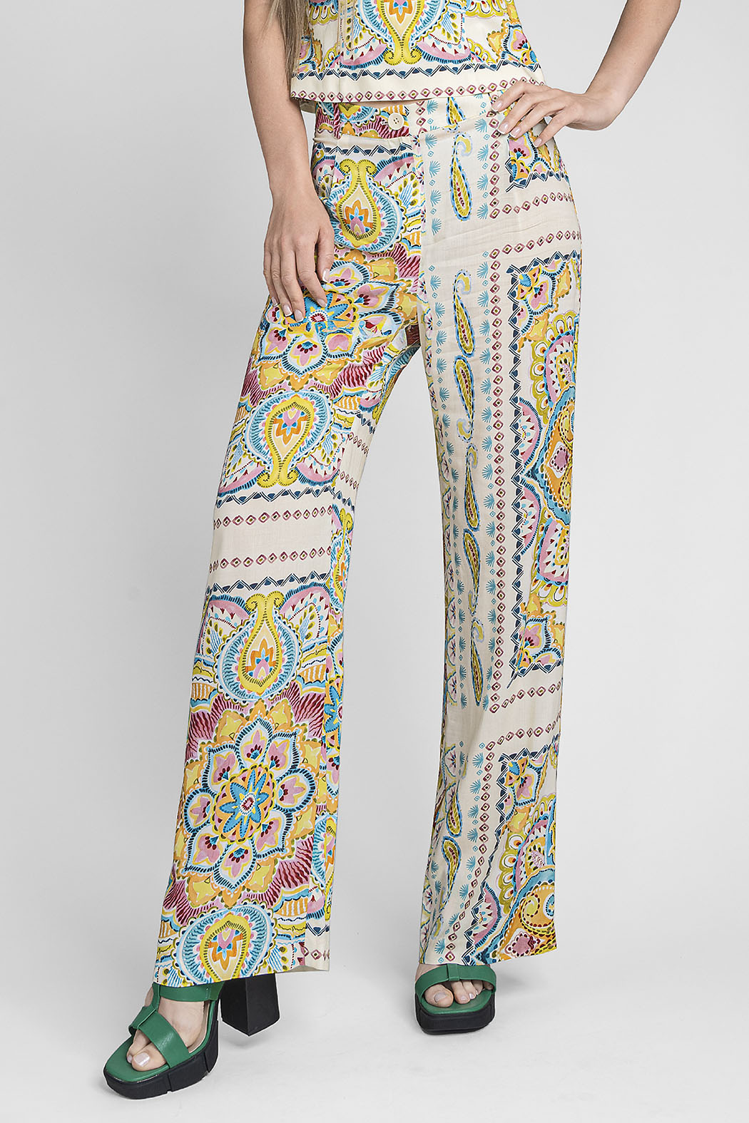 Luce Un Estilo Bohemio Y Sofisticado Con Este Pantalón De Pierna Ancha Que Ofrece Una Caída Espectacular Y Máxima Comodidad Y Destaca Por Un Vibrante Estampado De Mandalas Centrales En Una Paleta De Tonos Amarillos, Azules Y Corales Sobre Un Fondo Crema, Ideal Para Crear Un Look De Impacto En Tus Eventos De Verano O Vacaciones.