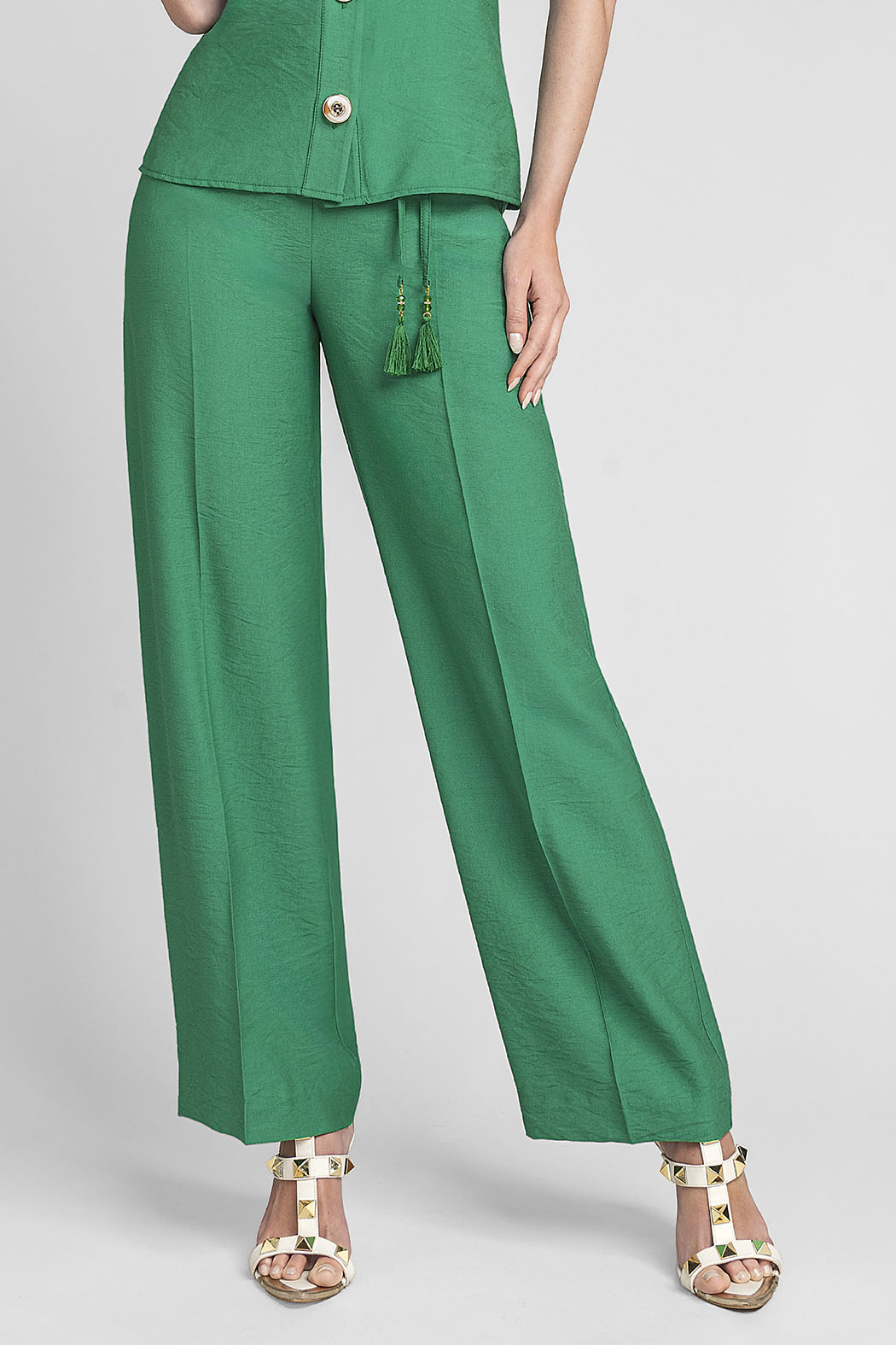 Este Pantalón De Vestir En Color Verde Vibrante Ofrece Un Estilo Impecable Con Su Corte Recto Y Fluido, Diseñado Para Brindar Comodidad Sin Perder La Elegancia. Cuenta Con Detalles Funcionales Como Bolsillos Laterales, Un Delicado Cinturón De Lazo Con Borlas Decorativas Que Acentúa La Cintura Y Una Caída Con Pinzas Que Estiliza La Silueta, Convirtiéndose En El Complemento Perfecto.