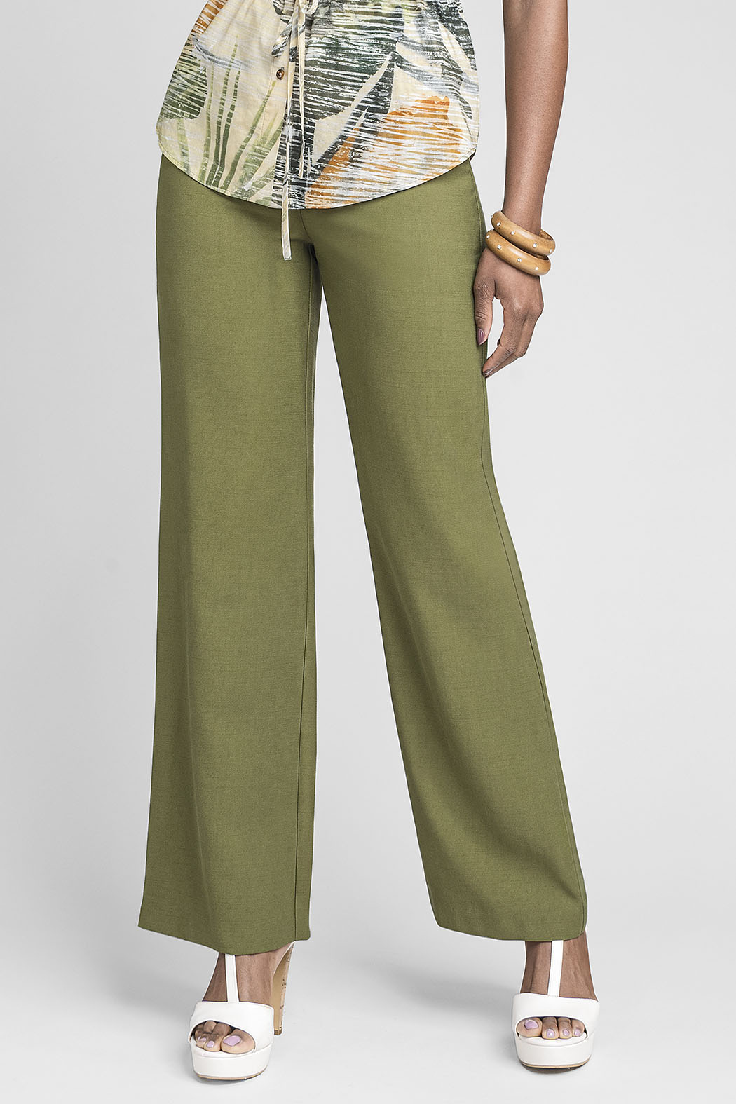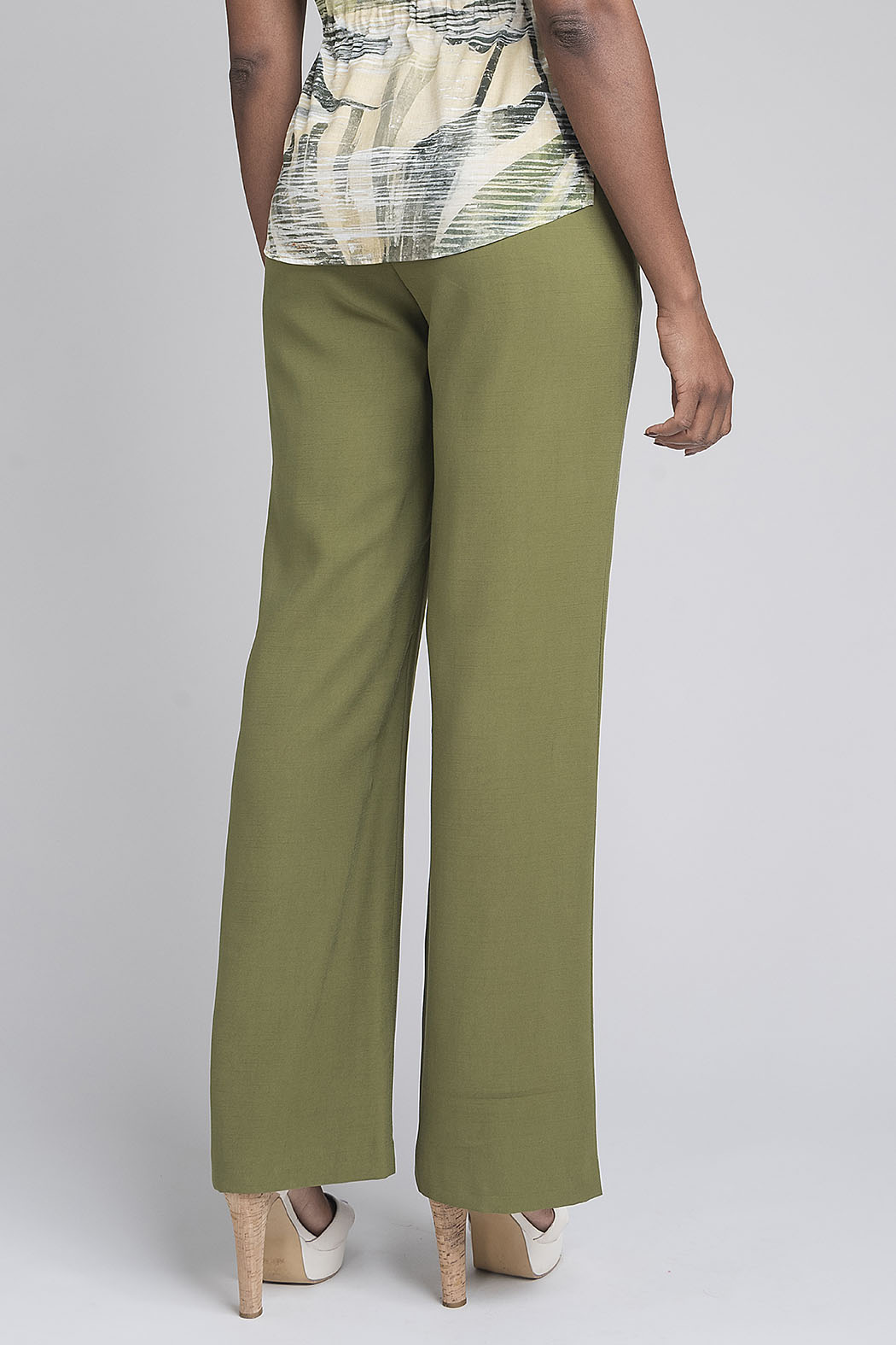 Este Elegante Pantalón De Corte Recto Y Tiro Alto En Color Verde Oliva Es Una Pieza Clave Para Un Armario Sofisticado. Presenta Un Diseño Limpio Con Cierre Frontal De Botón A Tono Y Cierre Oculto, Complementado Con Un Sutil Detalle Metálico Dorado En La Pretina Que Aporta Un Toque De Distinción. Su Caída Fluida Y Estructura Impecable Lo Convierten En Un Basico De Tu Armario.