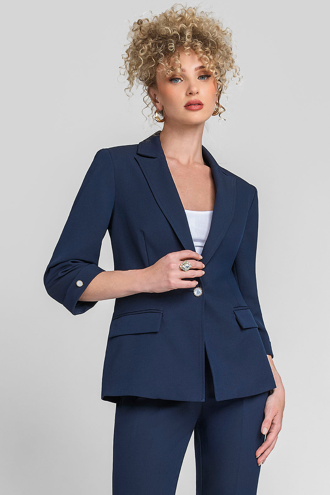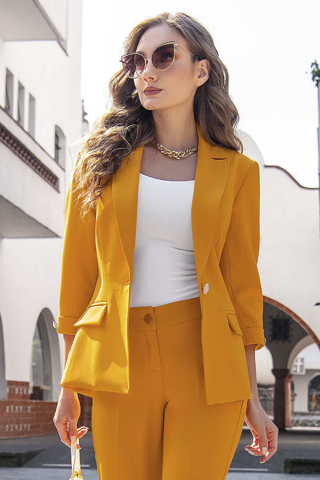 Elegante Blazer Entallado En Un Vibrante Color, Es La Prenda Clave Para Inyectar Energía Y Profesionalismo A Tu Vestuario De Trabajo O Eventos Semi-Formales. Su Diseño Destaca Por Una Silueta Estructurada Con Solapas De Muesca Clásicas Y Un Cierre Frontal De Un Solo Botón Decorativo, Que Define La Cintura Con Sofisticación. Las Mangas De Tres Cuartos Con Puños Vueltos Y Los Bolsillos Laterales Con Solapa Añaden Un Toque Moderno Y Funcional, Mientras Que Su Tejido De Alta Calidad Asegura Un Ajuste Impecable Y Cómodo Durante Todo El Día. Es Una Pieza Sumamente Versátil Que Eleva Instantáneamente Un Atuendo Básico, Un Look Casual Con Mucha Personalidad.