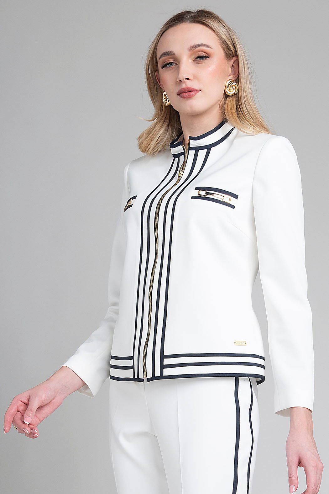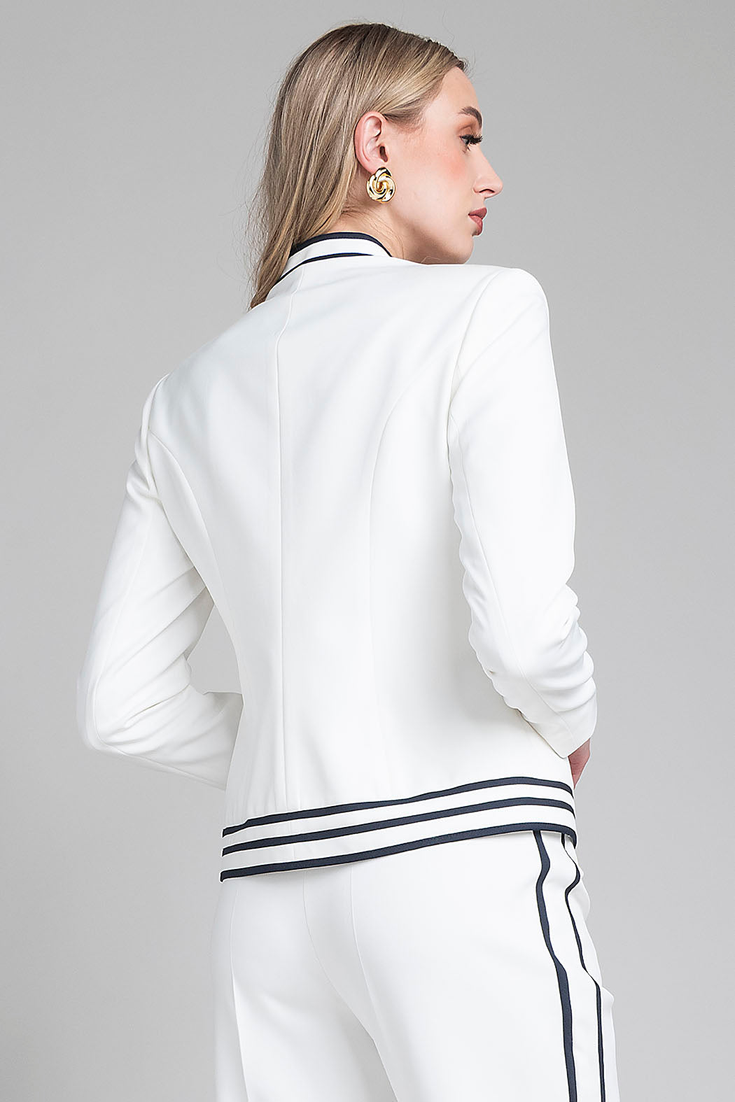 Chaqueta Blanca De Corte Ejecutivo Es Una Pieza De Alta Sofisticación Con Una Marcada Estética Náutica. Presenta Un Diseño Estructurado Con Cuello Mandarín Y Cierre Frontal De Cremallera Dorada, Acentuado Por Elegantes Líneas Verticales En Contraste Azul Marino Que Estilizan La Silueta. Destaca Por Sus Detalles De Lujo, Como Los Herrajes Dorados Tipo Eslabón En Los Bolsillos Simulados Y Un Ribete A Rayas En El Bajo, Ideal Para Un Look Profesional Moderno Y Pulido.
