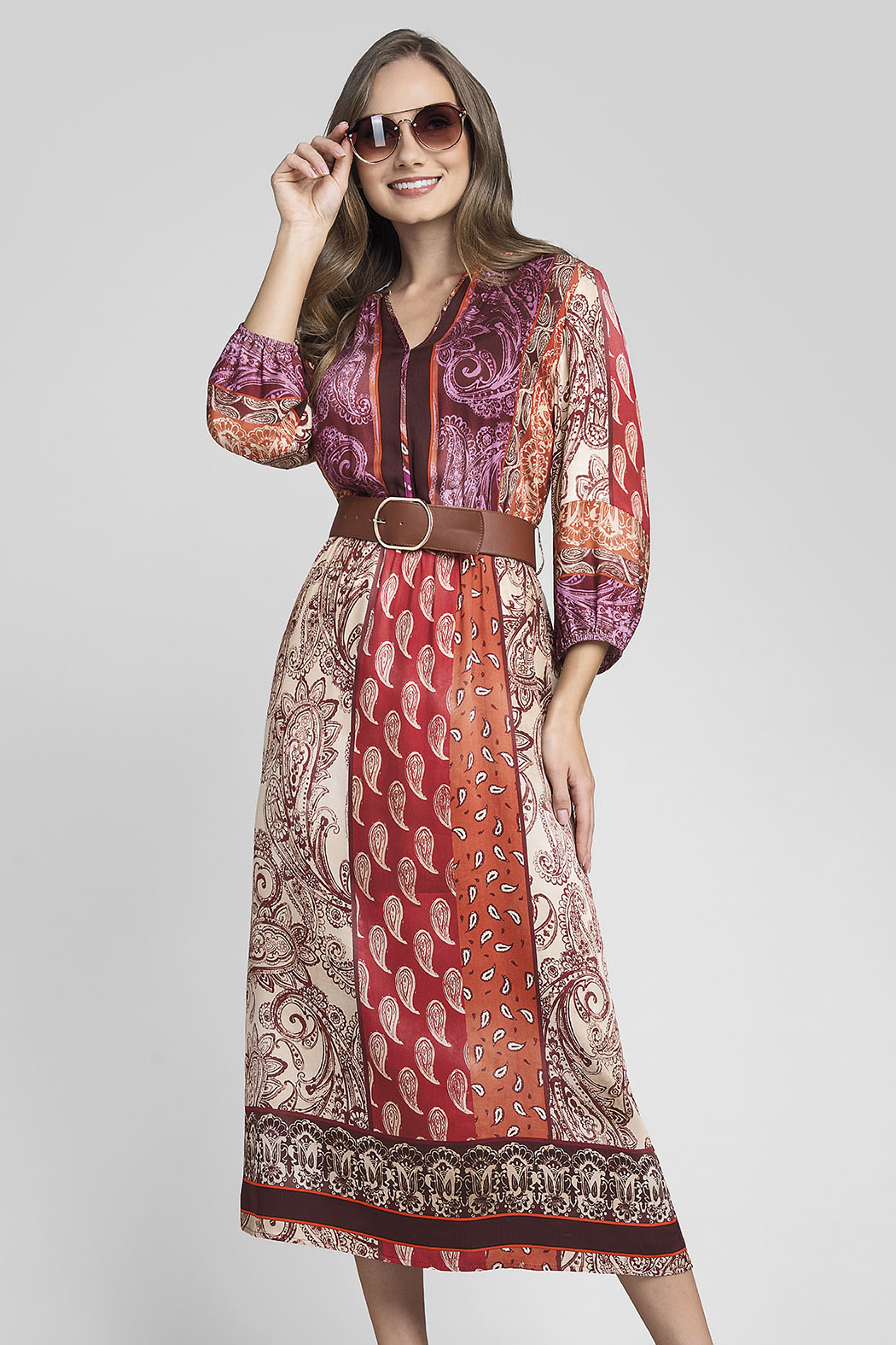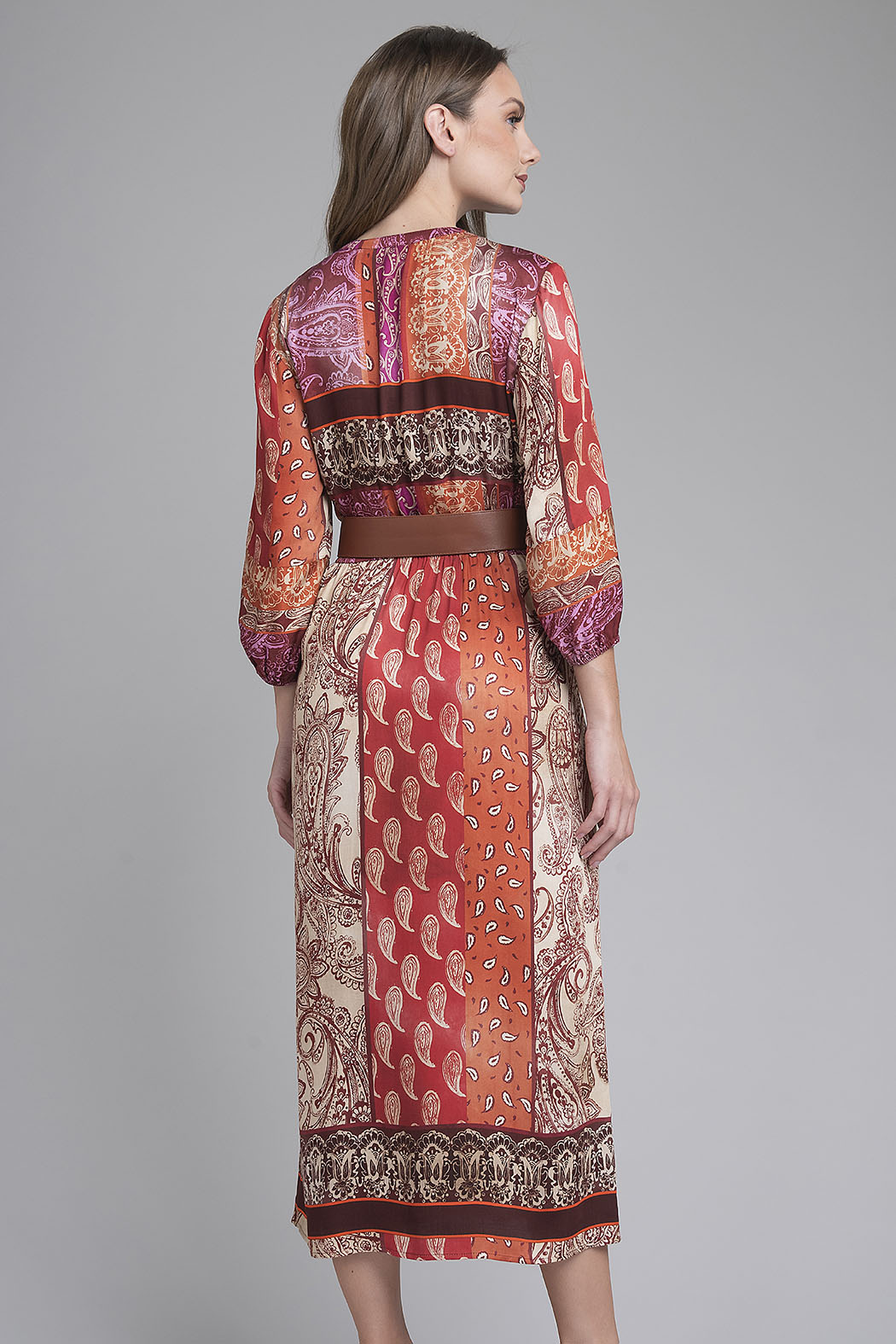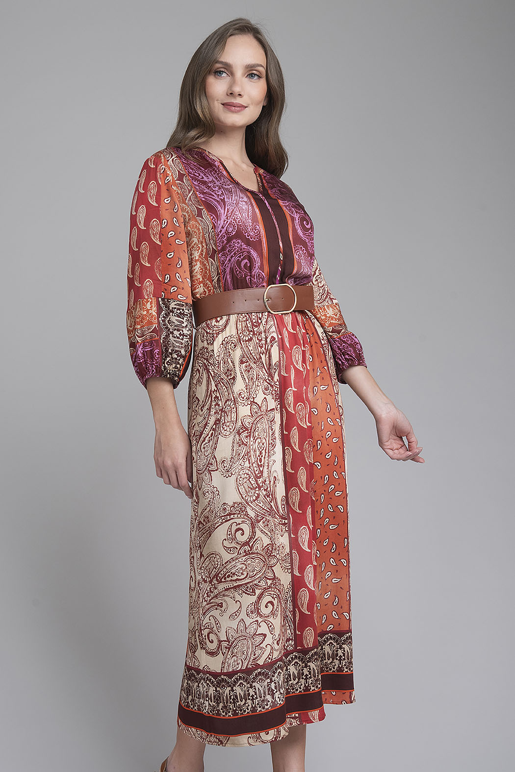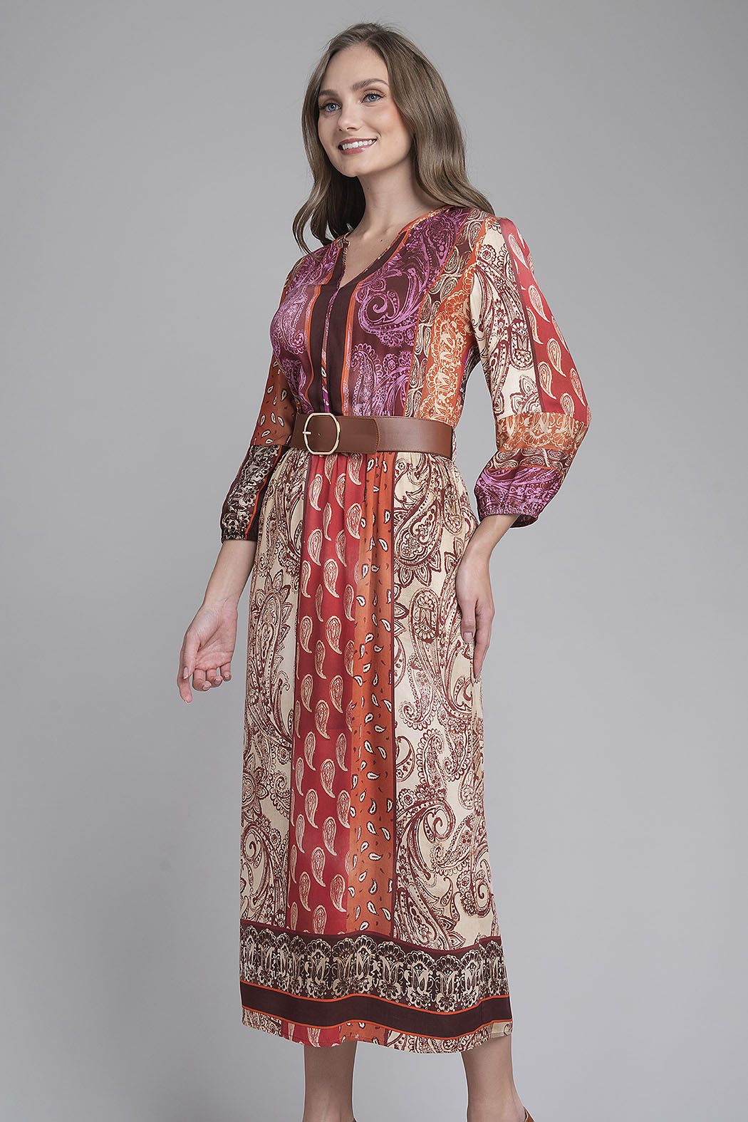 Vestido Largo De Estilo Bohemio Destaca Por Su Cautivador Diseño De Paneles Con Estampados Geométricos En Una Rica Paleta De Tonos Terracota, Uva Y Crema. Presenta Un Elegante Escote En V Con Cuello Mao, Mangas De Tres Cuartos Con Acabado Elástico Y Una Caída Fluida Que Aporta Movimiento Natural Al Caminar. El Diseño Se Complementa Con Un Cinturón Ancho En Color Camel Con Hebilla Metálica, Que Define La Cintura Para Crear Una Silueta Femenina Y Equilibrada, Ideal Para Eventos De Día O Una Cena Sofisticada Con Aire Artístico.