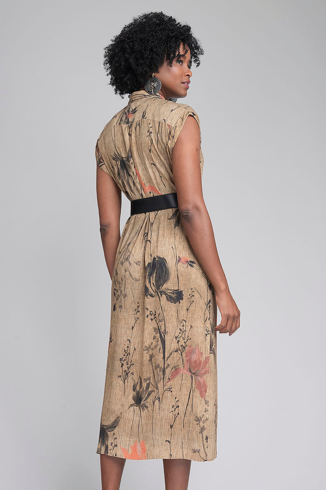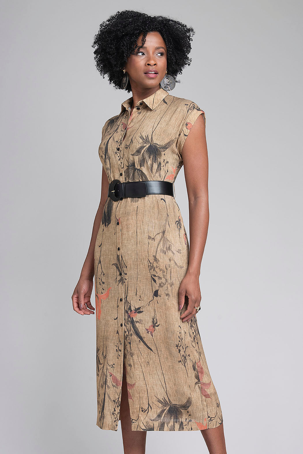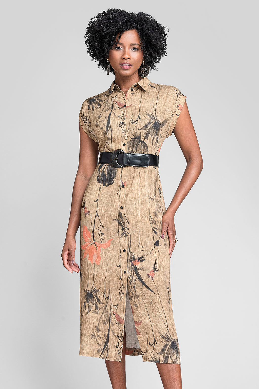 Vestido Camisero De Inspiración Natural En Un Sofisticado Tono Verde Oliva Es La Personificación De La Elegancia Rústica Y Moderna. Su Diseño Destaca Por Un Delicado Estampado Botánico De Flores Y Ramas En Tonos Oscuros Y Salmón, Sobre Un Tejido Con Textura Que Recuerda Al Lino, Ideal Para Mantener La Frescura Con Estilo. Presenta Un Cierre Frontal Completo Con Botones Negros A Contraste, Cuello Clásico Y Mangas Cortas De Corte Japonés Que Suavizan La Silueta. La Pieza Se Completa Con Un Cinturón Negro De Hebilla Circular Que Define La Cintura, Creando Una Forma Femenina Y Estructurada Perfecta Para Eventos De Día O Una Jornada De Oficina Con Distinción.