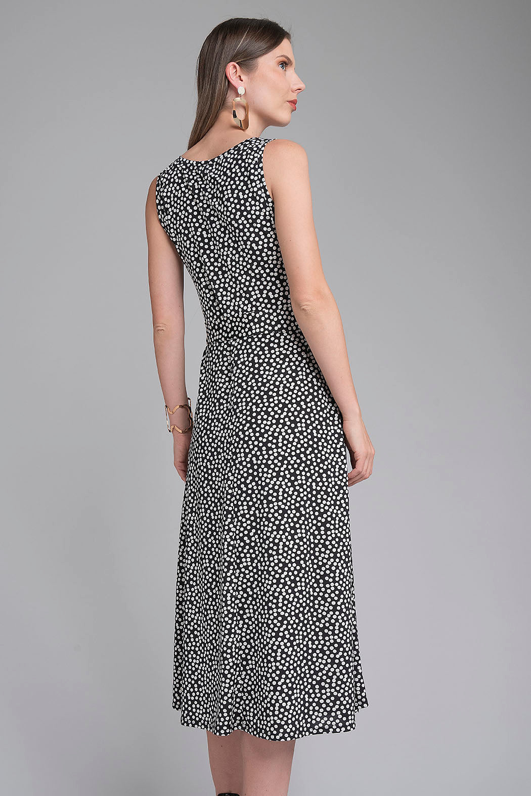Vestido Largo Sin Mangas Es Una Oda A La Sofisticación Clásica, Presentando Un Atemporal Estampado De Lunares Blancos Sobre Fondo Negro Que Nunca Pasa De Moda. Su Diseño Se Distingue Por Un Elegante Cuello Redondo Y Una Silueta Fluida Que Se Ciñe Delicadamente A La Cintura Gracias A Un Cinturón A Juego Con Hebilla Dorada, Realzando La Figura De Forma Natural. Confeccionado En Un Tejido Ligero Que Garantiza Una Caída Impecable, Esta Prenda Es La Opción Ideal Para Eventos De Verano, Cenas Especiales O Cualquier Ocasión Donde Se Busque Un Equilibrio Perfecto Entre Comodidad Y Estilo Refinado.