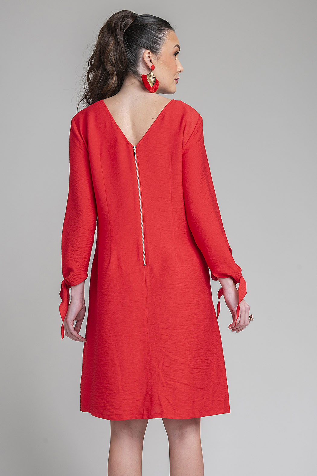 Vestido Corto Es Una Pieza Elegante Y Minimalista, Diseñada Con Una Textura Corrugada Que Añade Profundidad Y Un Toque Sofisticado Al Tejido. Su Diseño Presenta Un Cuello Redondo Con Una Delicada Abertura Tipo Lágrima En El Escote Y Mangas Largas Terminadas En Puños Con Lazo Ajustable, Aportando Un Aire Romántico Y Femenino. Con Un Corte Fluido Que Ofrece Comodidad Sin Perder El Estilo, Este Vestido Es La Opción Perfecta Para Eventos De Día O Cócteles Donde Se Busca Un Equilibrio Entre Sobriedad Y Un Color Impactante.
