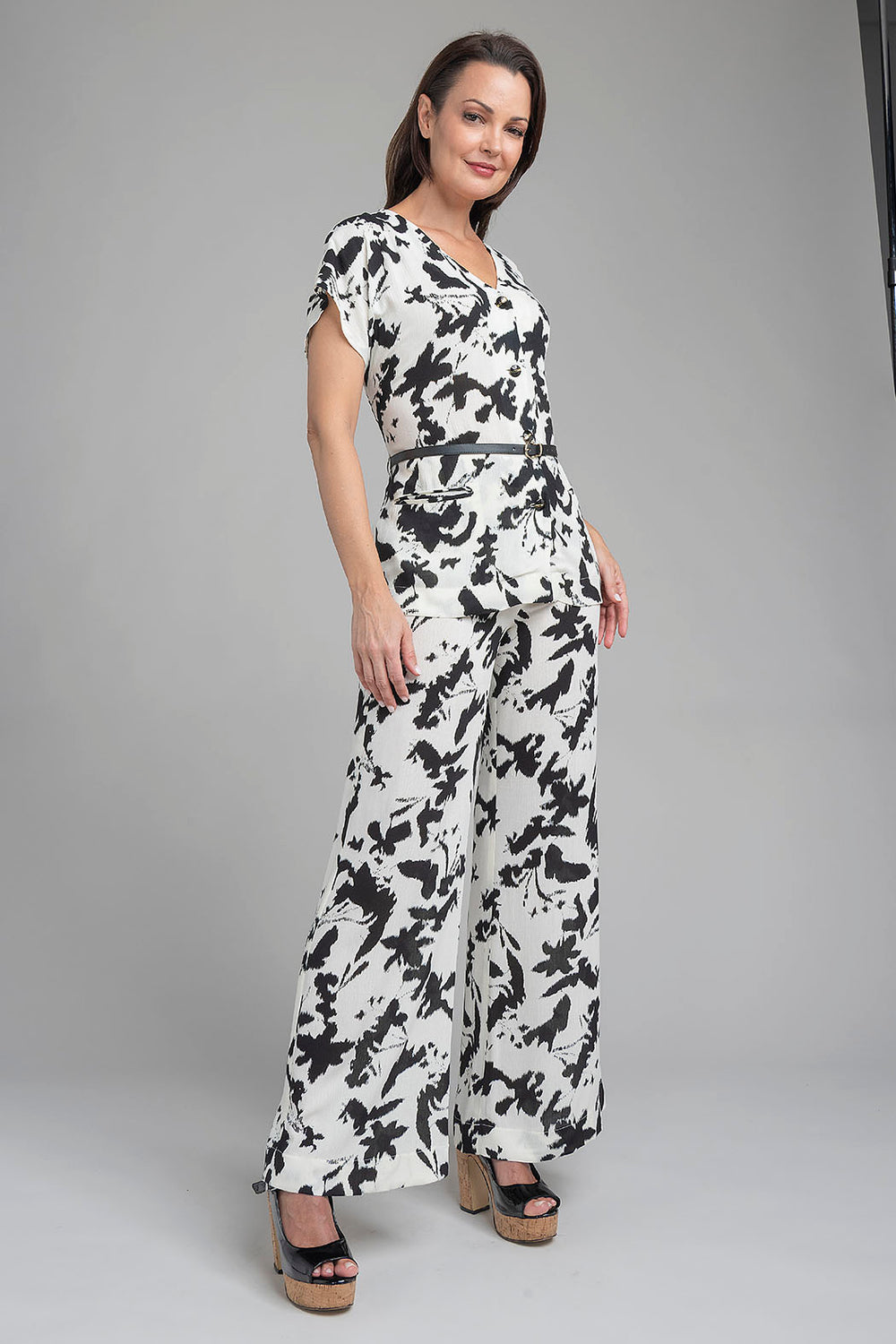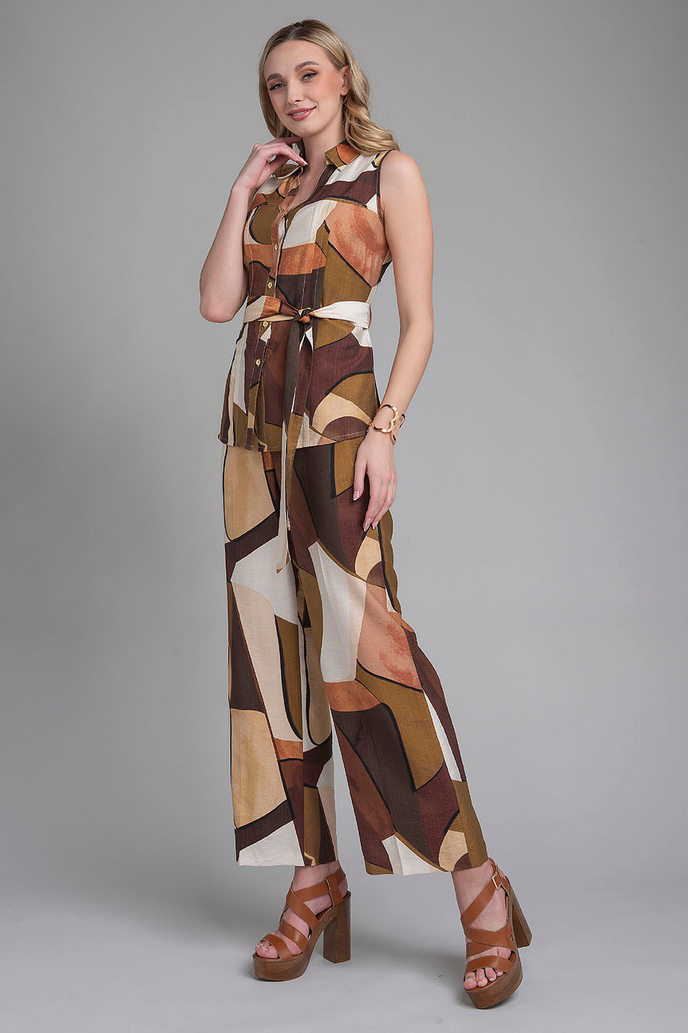 Conjunto De Pantalon Y Blusa Estampada Con Cinturon