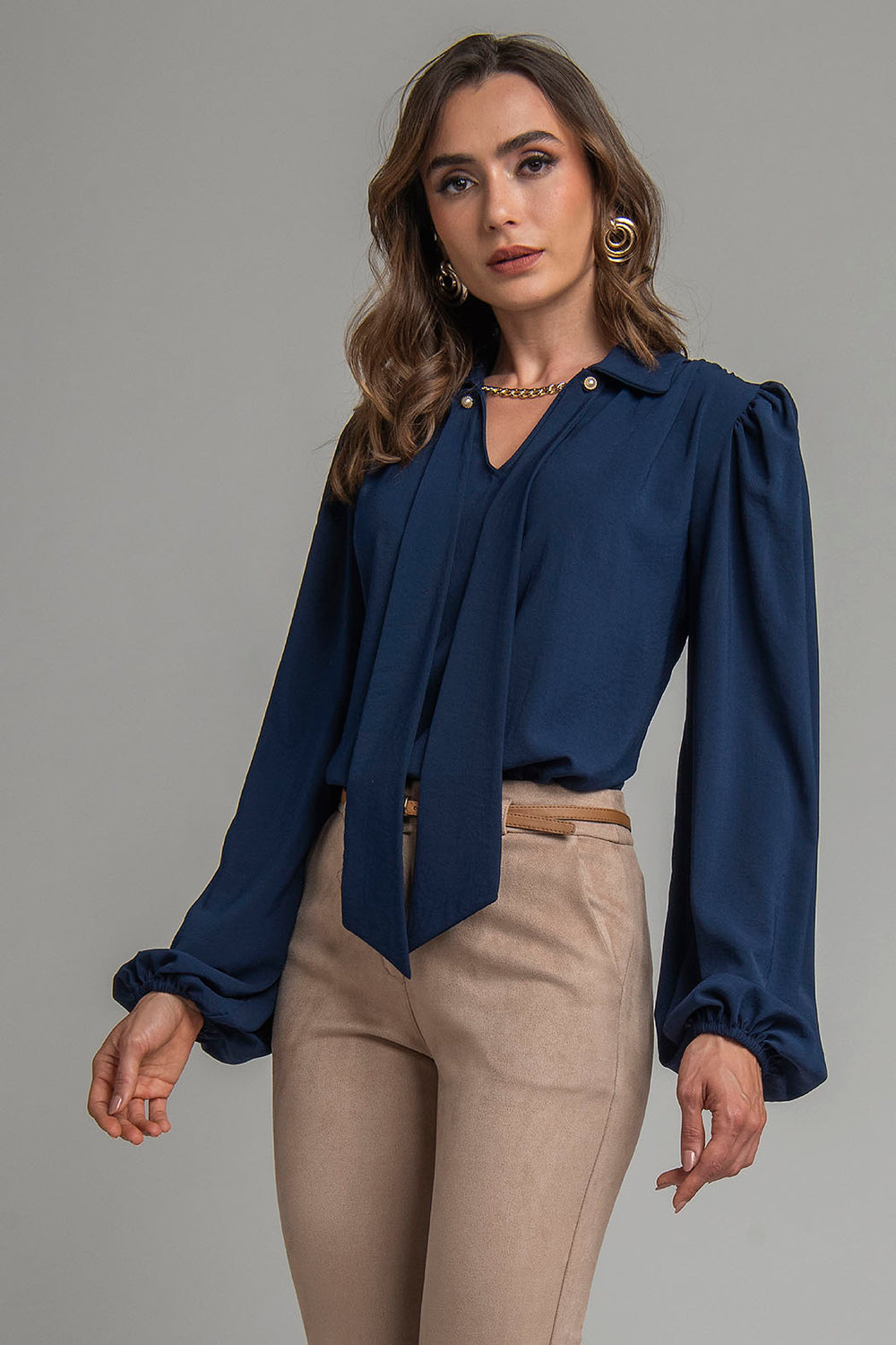 Blusa Lisa De Manga Larga Con Detalle De Tira Con Brillos Y Abertura Al Frente