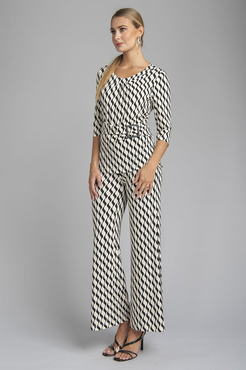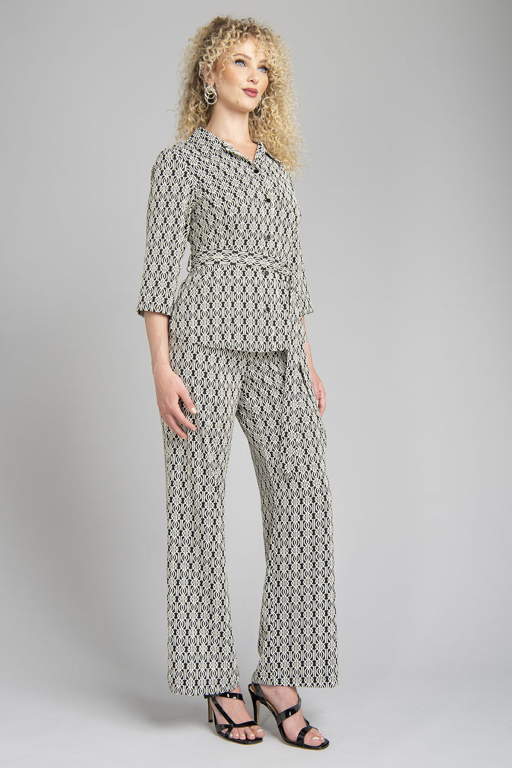 Conjunto De Pantalon Y Blusa Con Estampado De Gregas Y Detalle De Cinturon