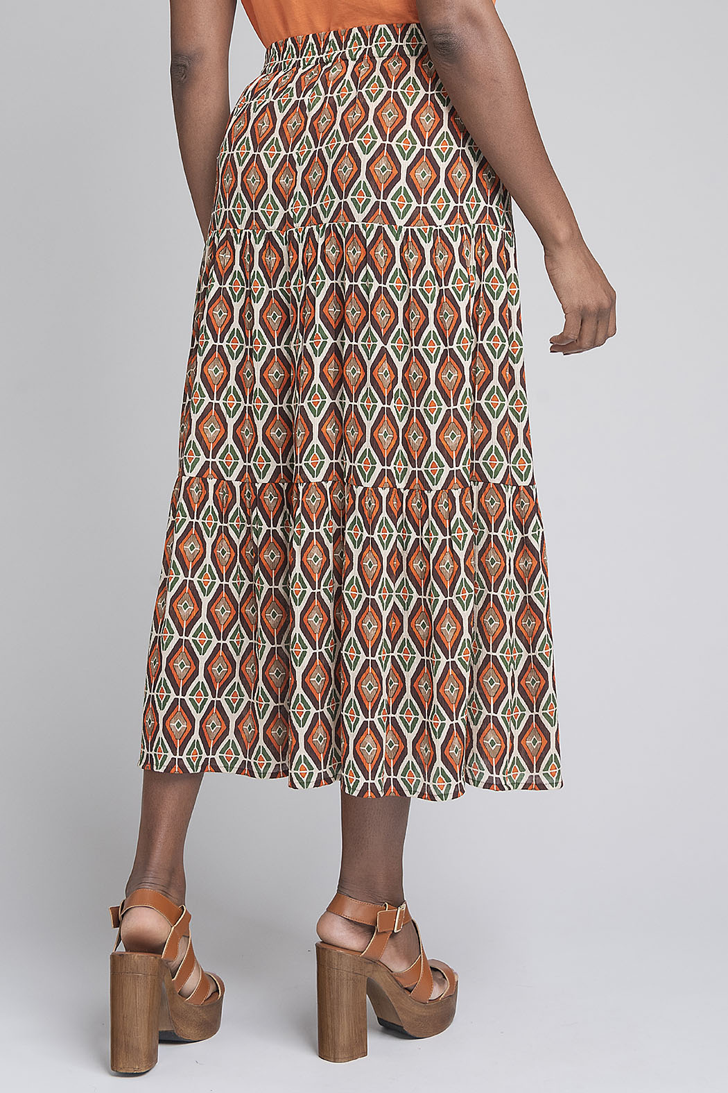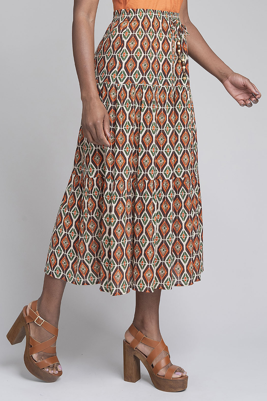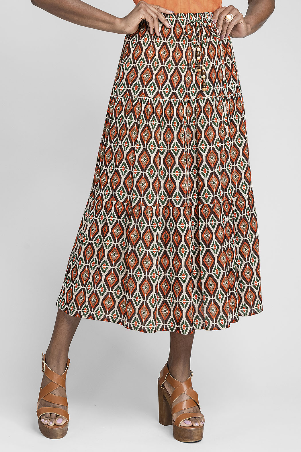 Falda Maxi Es La Pieza Ideal Para Quienes Buscan Un Estilo Bohemio Y Sofisticado Con Un Toque Artesanal. Destaca Por Su Vibrante Estampado Geométrico De Rombos En Una Paleta De Colores Tierra Que Incluye Naranja, Verde Y Ocre, Organizada En Paneles Escalonados Que Aportan Un Movimiento Fluido Y Femenino Al Caminar. El Diseño Se Completa Con Una Cintura Elástica Fruncida Que Garantiza Un Ajuste Cómodo Y Versátil, Realzada Por Un Cordón Decorativo Con Detalles De Cuentas De Madera Que Refuerzan Su Estética Natural. Es Una Prenda Perfecta Para Combinar Con Sandalias Planas O Cuñas, Logrando Un Look Relajado Pero Lleno De Personalidad.