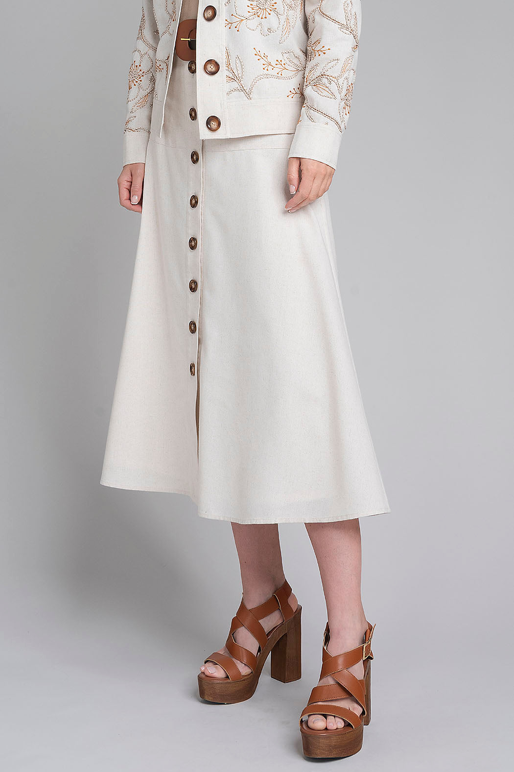 Logra Un Estilo Impecable Y Natural Con Esta Falda Midi Confeccionada En Una Mezcla De Lino De Alta Calidad. Su Diseño Destaca Por Una Hilera Vertical De Botones Tipo Carey Que Estiliza La Figura Y Aporta Un Aire Clásico. Incluye Un Cinturón Con Hebilla Dorada Que Define La Cintura Con Precisión. Gracias A Su Tejido Transpirable Y Su Caída Fluida, Es La Prenda Base Ideal Para Combinar Con La Chaqueta Bordada O Blusas Ligeras, Perfecta Para Eventos De Día O Un Entorno Profesional Sofisticado.