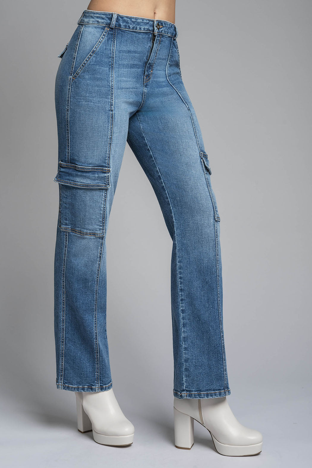 Jeans Liso Corte Recto Con Bolsas Laterales