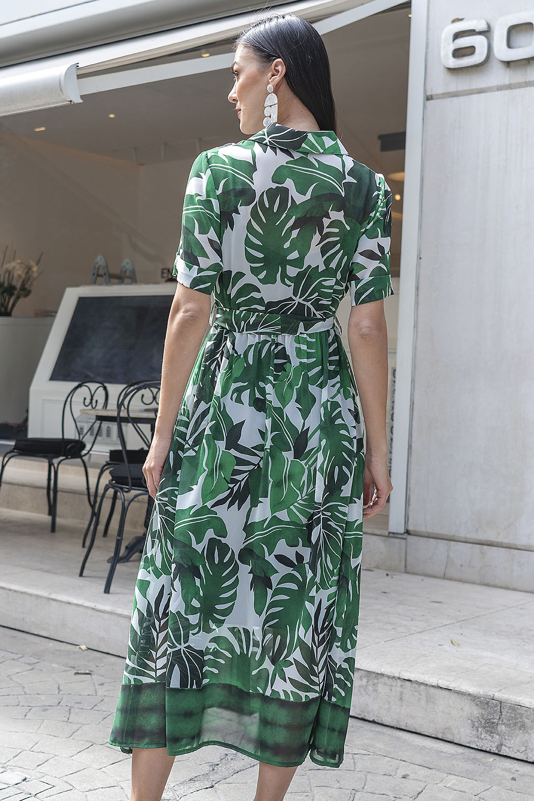 Fresco Vestido Largo Presenta Un Llamativo Estampado De Hojas Tropicales En Diversos Tonos De Verde Sobre Fondo Blanco, Ideal Para Un Estilo Exótico Y Moderno. Su Diseño Cuenta Con Cuello Camisero, Cierre Frontal De Botones, Mangas Cortas Ajustables Y Un Cinturón Del Mismo Tejido Que Resalta La Figura, Ofreciendo Un Look Sofisticado Y Relajado.