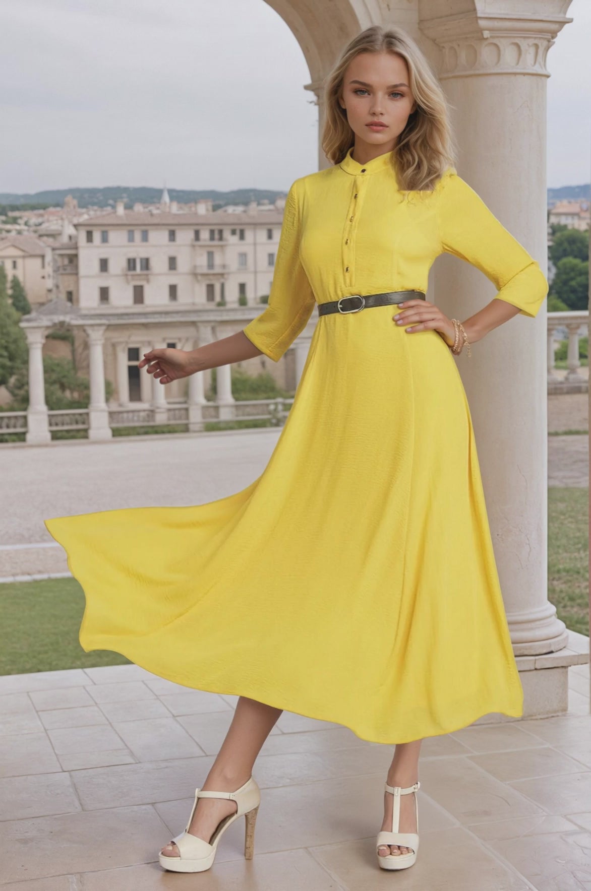 Vestido Midi En Amarillo Vibrante Destaca Por Su Fluido Diseño De Cuello Mao, Mangas Tres Cuartos Y Una Falda De Gran Vuelo Que Aporta Un Movimiento Etéreo. Confeccionado En 100% Poliéster, Garantiza Una Ligereza Excepcional, Colores Intensos Duraderos Y Una Resistencia Natural A Las Arrugas, Convirtiéndose En La Pieza Ideal Para Celebraciones Especiales Que Exigen Comodidad Y Elegancia.