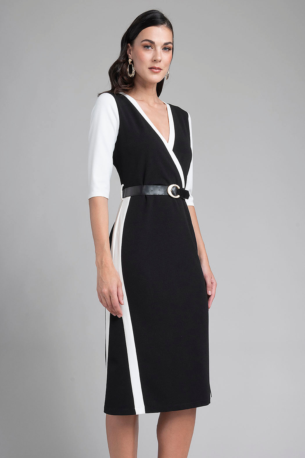 Vestido Midi De Silueta Tipo Lápiz Presenta Un Elegante Diseño De Bloques De Color En Blanco Y Negro Que Estiliza Visualmente La Figura. Destaca Por Su Escote Cruzado En "V" Con Solapas A Contraste Y Mangas De Tres Cuartos, Complementado Por Un Cinturón Delgado Con Una Hebilla Dorada Geométrica Que Define La Cintura. Es Una Pieza Sofisticada Y Estructurada, Ideal Para Entornos Profesionales O Eventos Que Requieren Un Look Pulido Y Moderno.