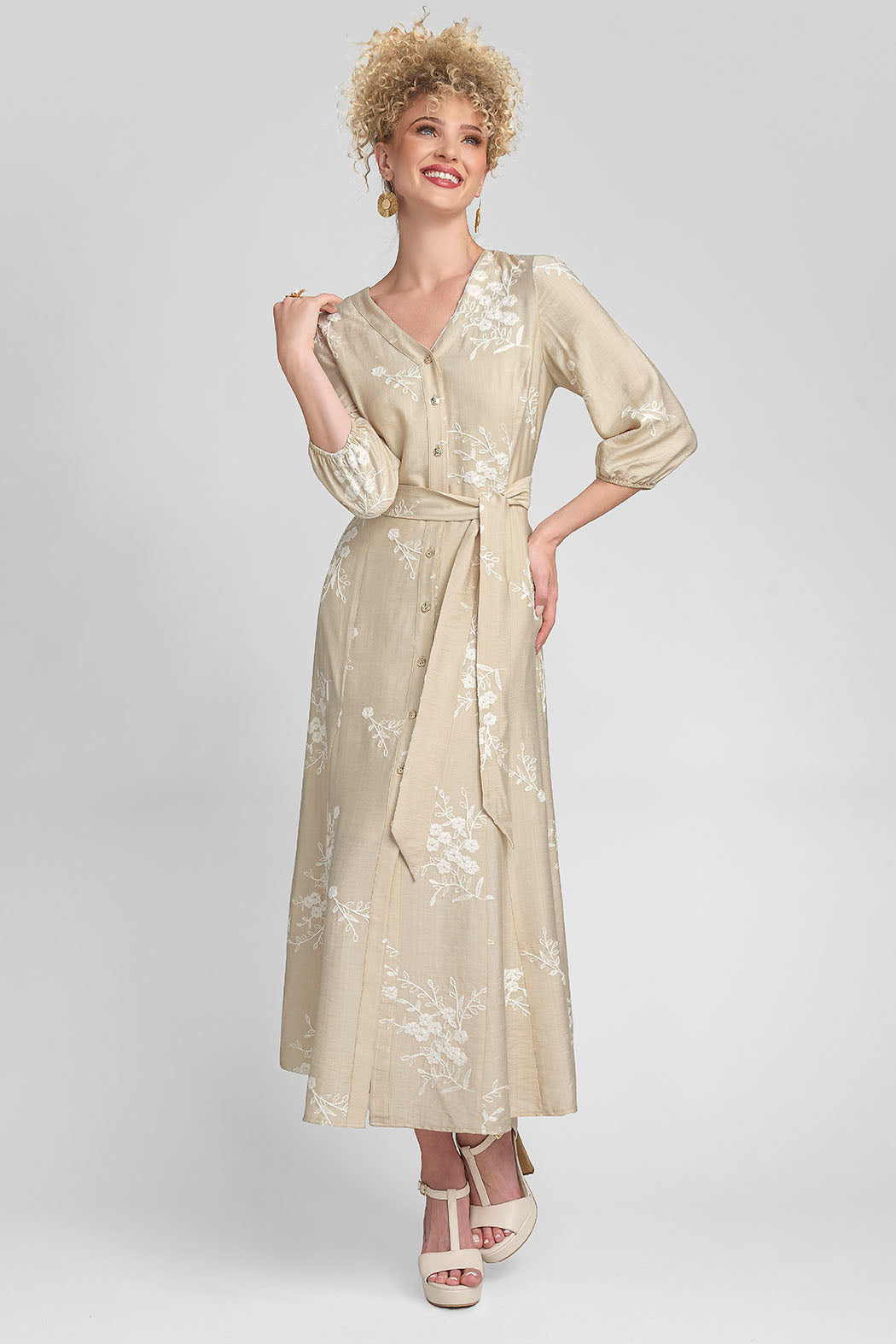 Vestido Largo Estampado De Botones Al Frente Cuello V Y Cinturon